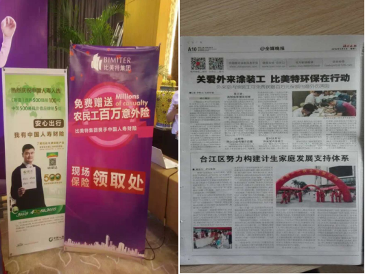 2017年是比美特集团加盟店布遍全国千个城市的一年,这一年,比美特集团迎来了欣喜的九周年庆。这是值得千店同庆、盛摆宴席的周年庆典,然而比美特集团选择了另外一种庆祝方式——“为全国的农民工免费购买百万意外伤害保险”。比美特集团一百五十多名员工奔赴在全国一百多个城市,协助一百多家店面同时开展“为全国农民工免费购买百万意外伤害保险”公益行动,在总部指挥协调下,开启了一场浩大的百市同开的社会公益大型行动,引起了社会各界人士及媒体的反响。