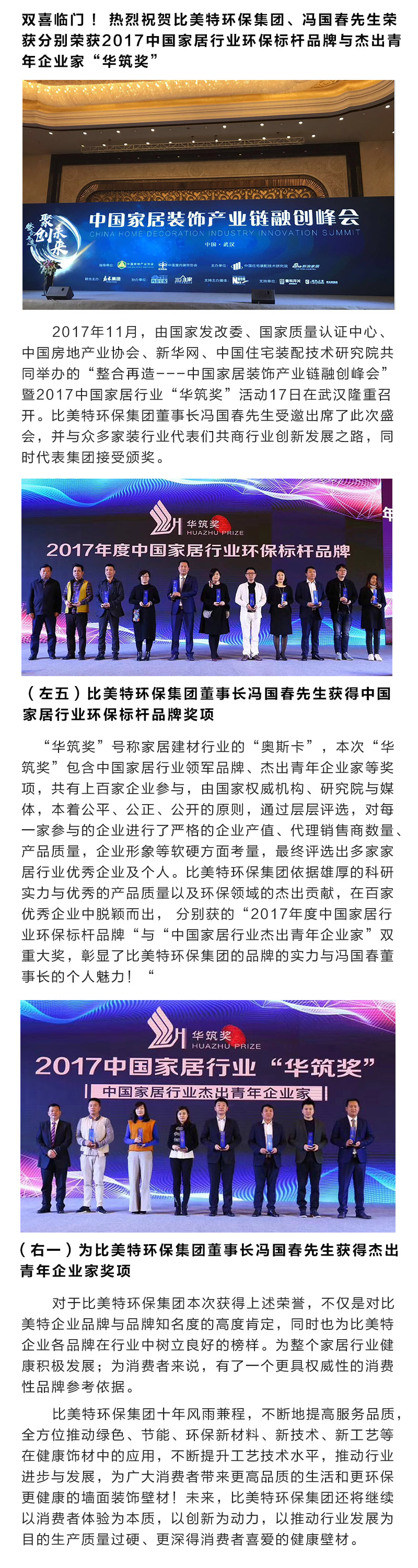 双喜临门! 热烈祝贺比美特环保集团、冯国春先生荣获分别荣获2017中国家居行业环保标杆品牌与杰出青年企业家“华筑奖”