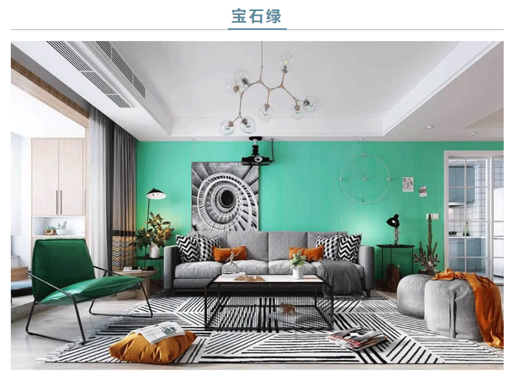 将这抹淡雅的色调带入到夏日的家居世界中,搭配少量的橙黄色与金属使其柔和,宝石绿的高贵魅力便多了几分平易近人的味道。