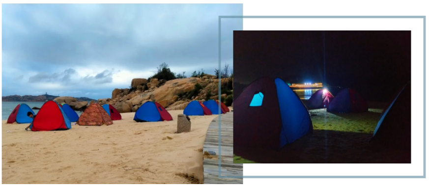 我们吹着海风,大家一起支起帐篷
