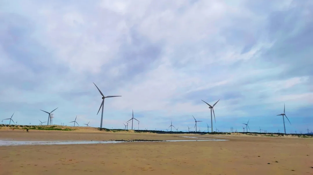洁白的云朵、一排排高耸的风车