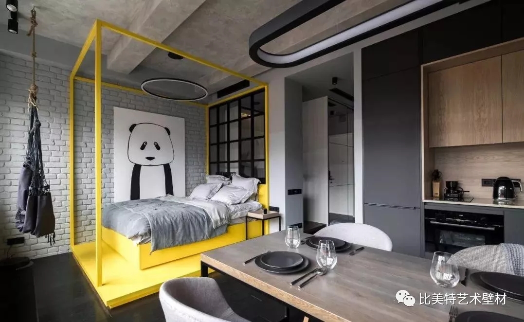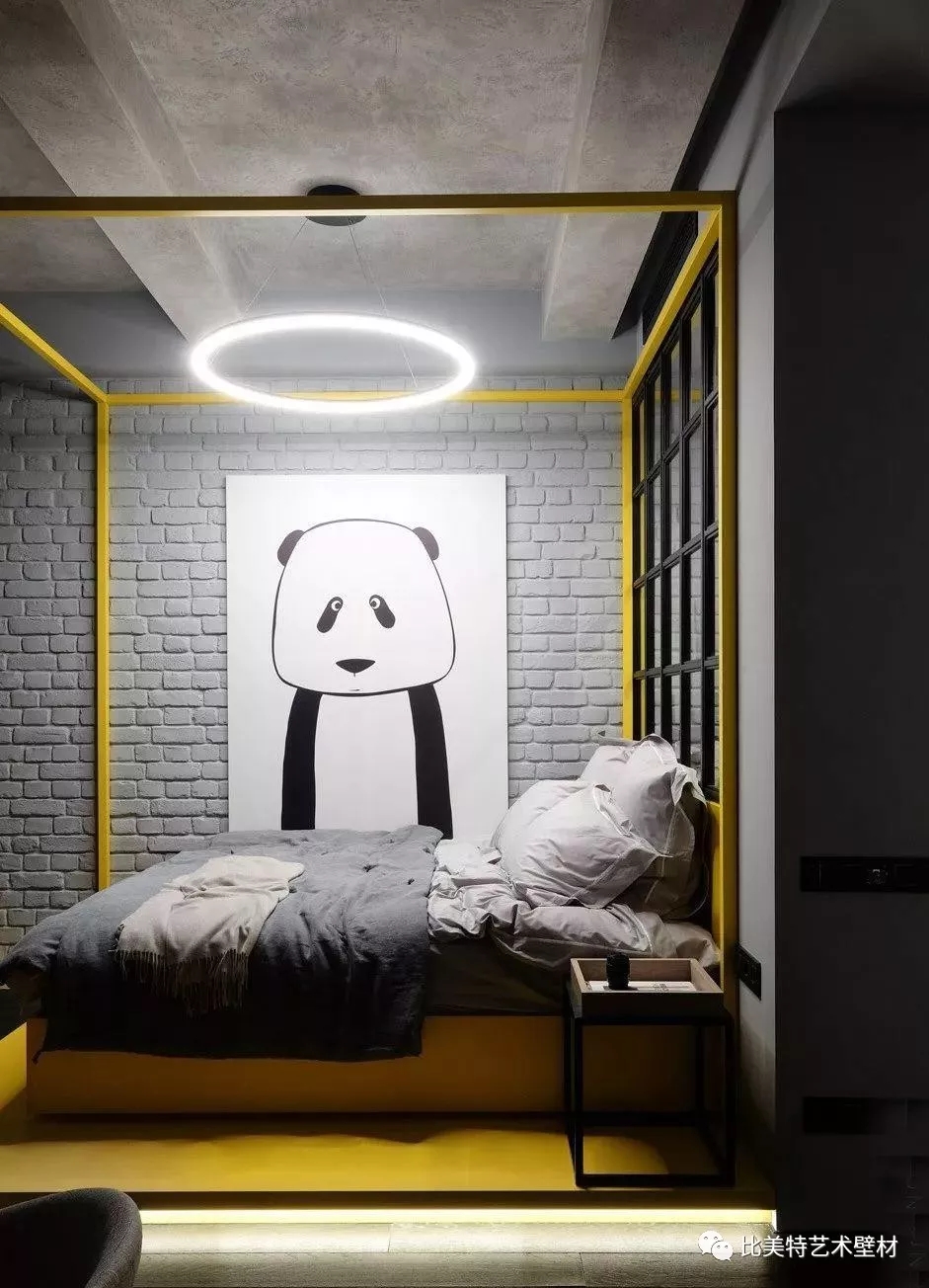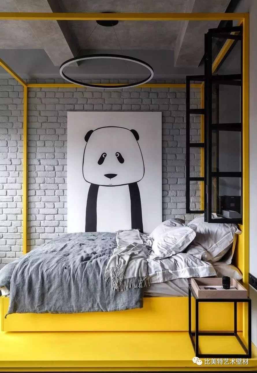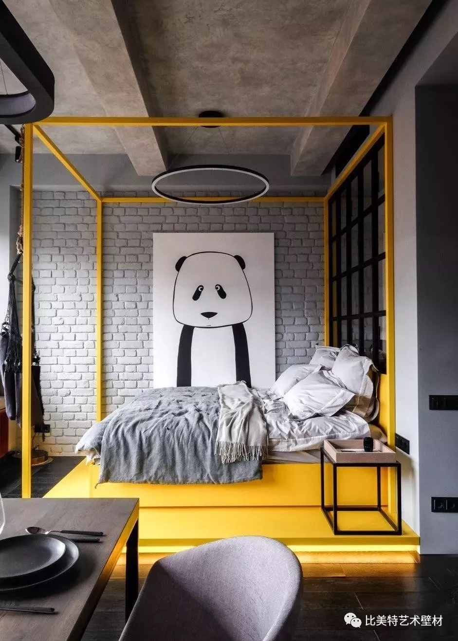 特别定制的黄色铁艺架将卧室区域围了起来,并以灰色的工业感砖墙搭配可爱的熊猫挂画,营造前卫现代的视觉空间。