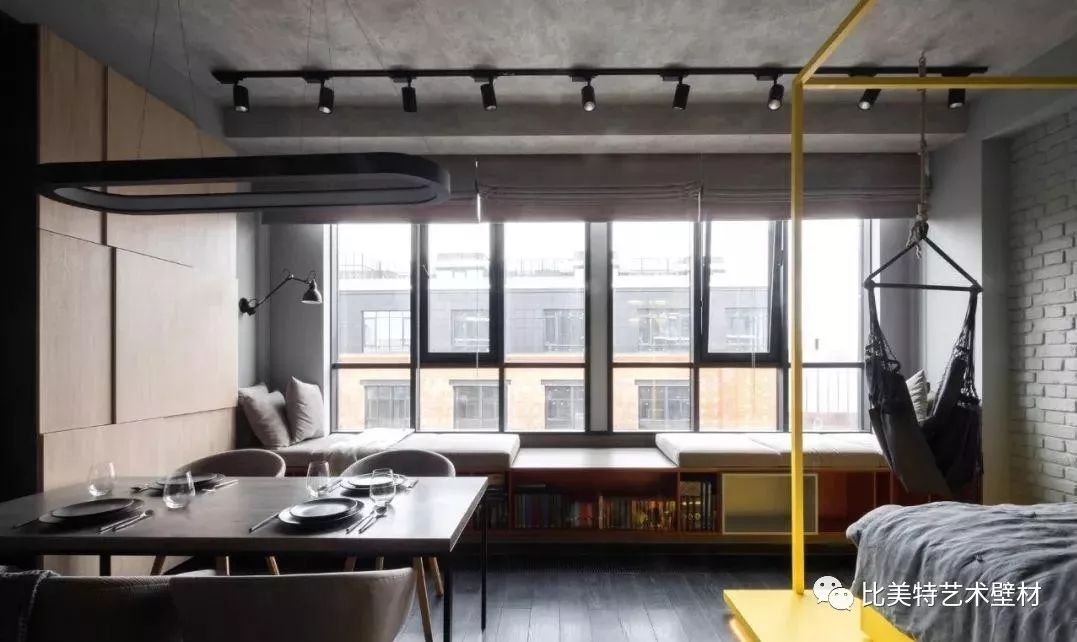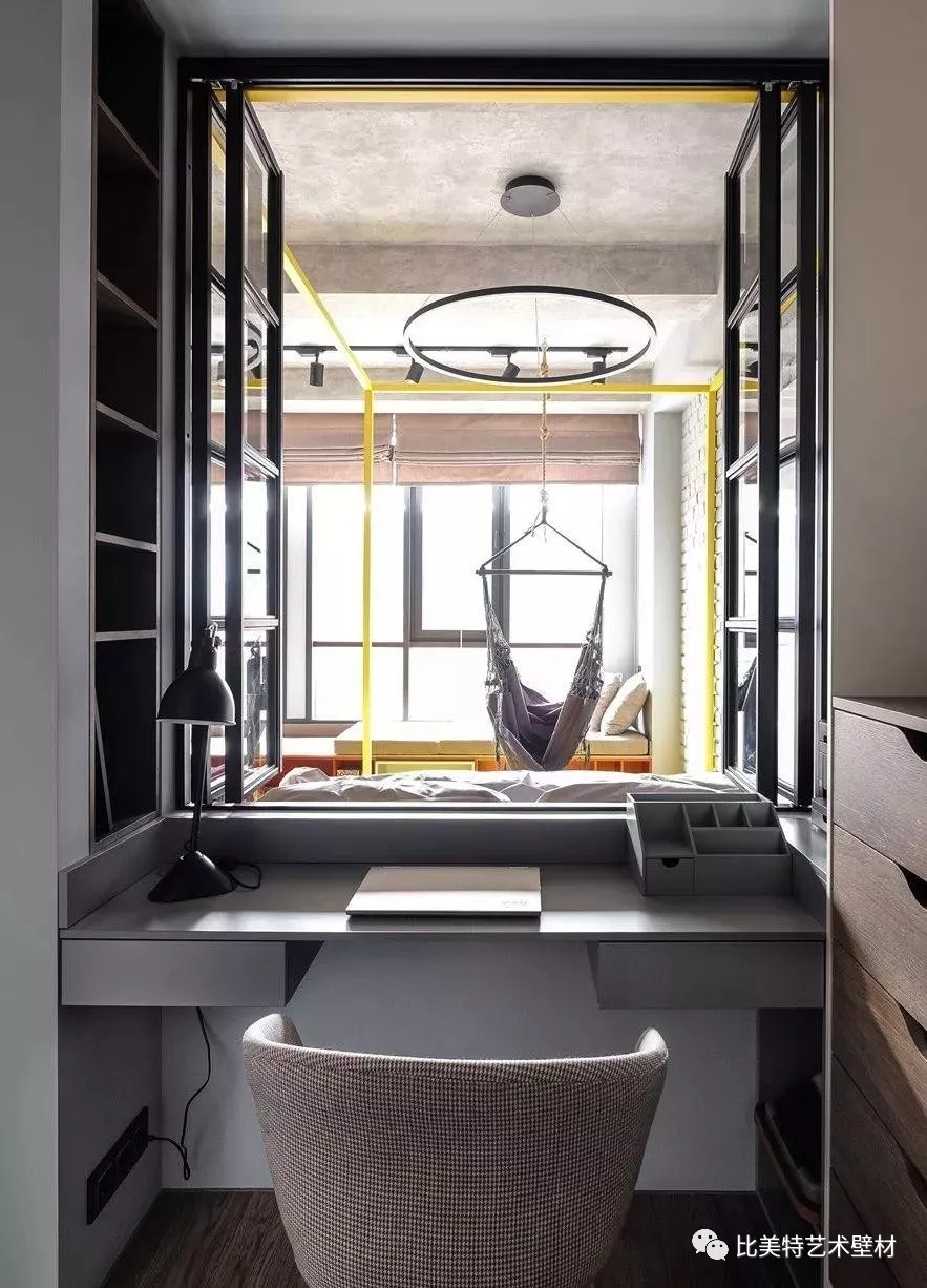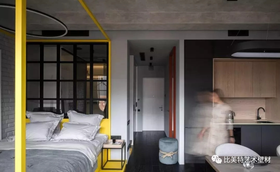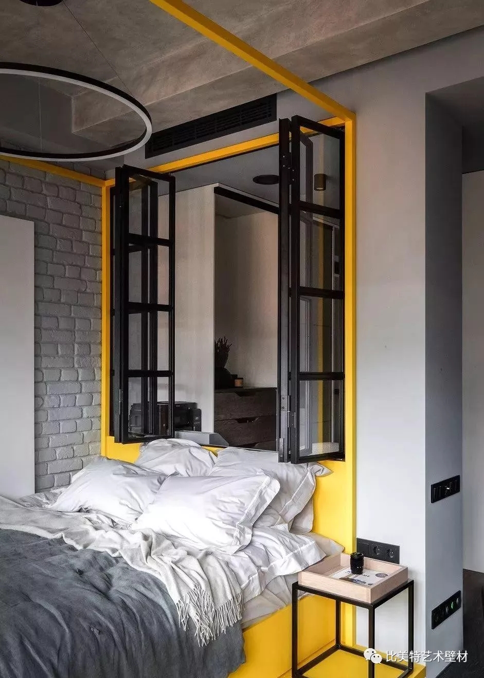 特别定制的黄色铁艺架将卧室区域围了起来,并以灰色的工业感砖墙搭配可爱的熊猫挂画,营造前卫现代的视觉空间。