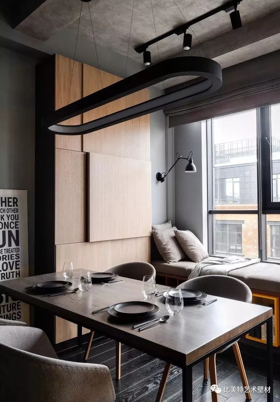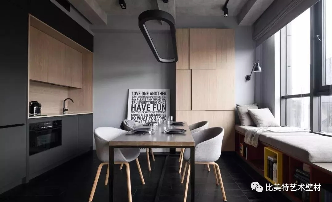 简约的木质餐桌与自然摆放在地面的字母海报,勾勒出悠闲而雅致的用餐空间。