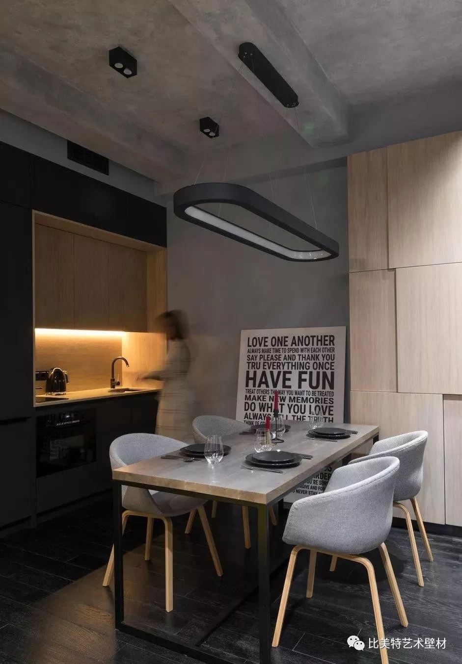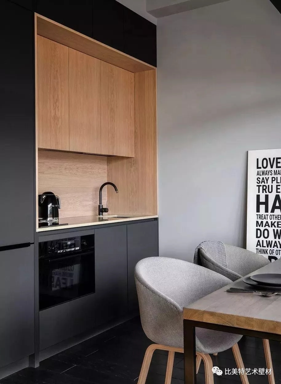 另一边是餐厨区,由于屋主对厨房没有很高的使用需求,所以设计师简化了设计,并选择了更加节省空间的开放式厨房。