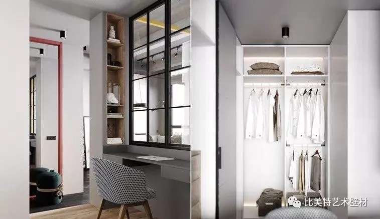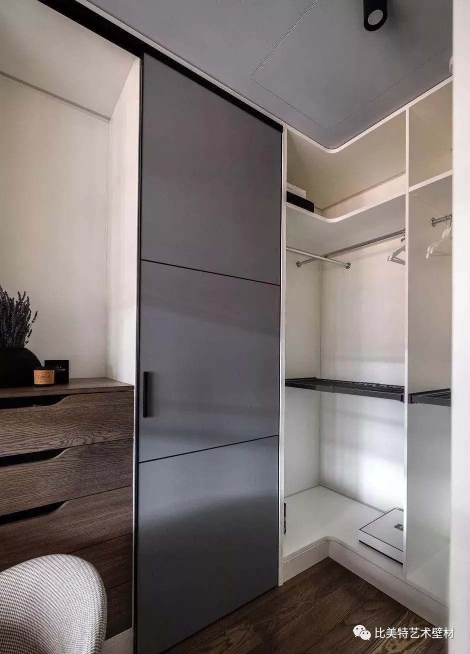 半开放式的大容量墙角衣柜,既充分利用了空间满足了收纳的功能,也是设计师帮助屋主实现“衣帽间”梦想的小巧思。