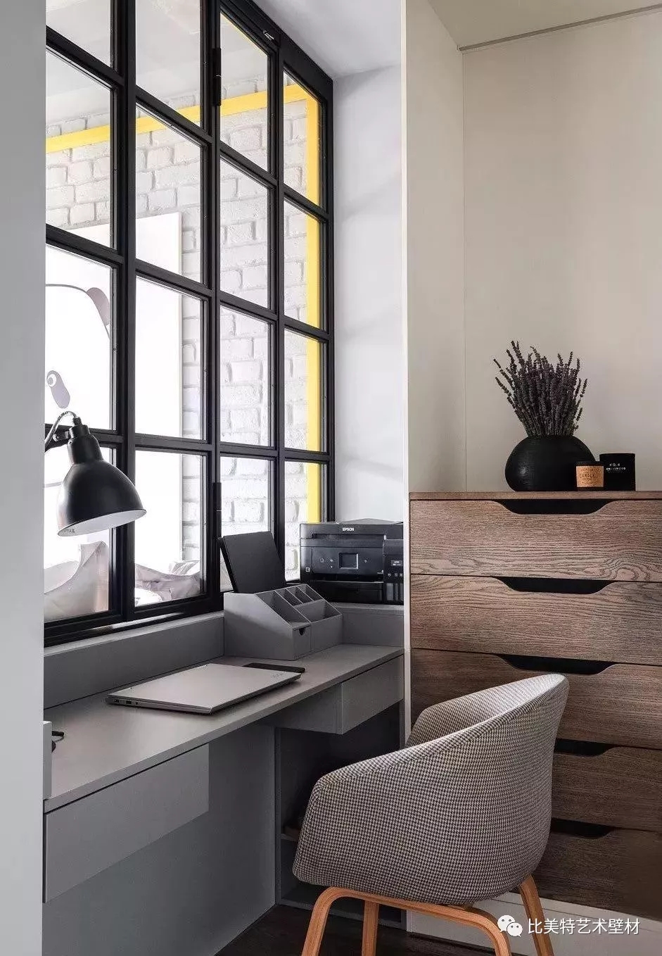 玄关的左手边既是书房也是衣帽间,整个空间用深灰色与深木色打造一个静谧的工作空间。以铁艺玻璃窗展现工业风,同时为这个空间引入了光源。