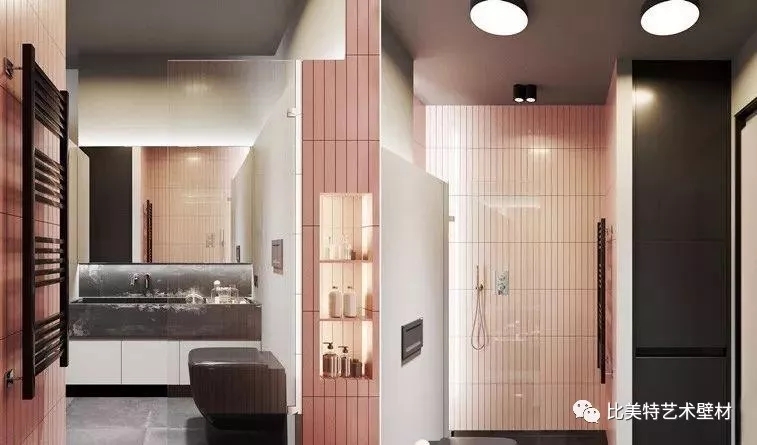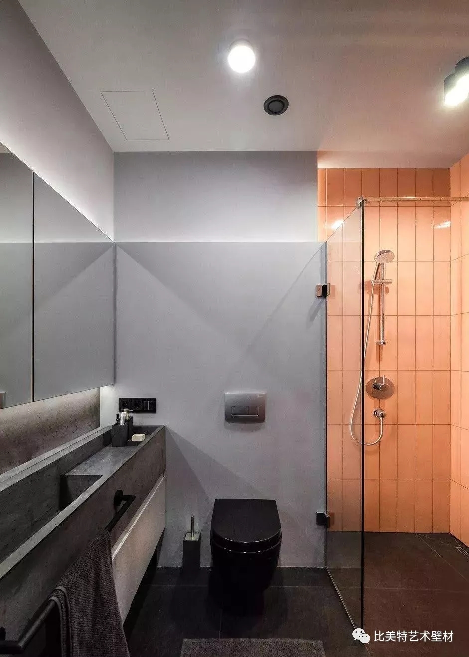玄关右侧是卫浴空间,深灰色系的地板及墙面搭配粉色的瓷砖,营造清新的质感。用玻璃来实现干湿隔离的设计,实用同时还解决了小空间的光线问题,保持了通透感。