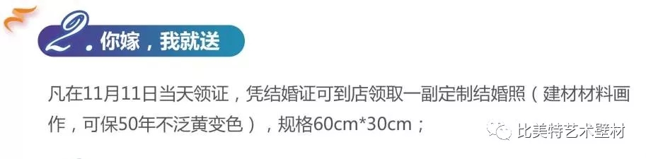 凡在11月11日当天领证,凭结婚证可到店领取一副定制结婚照(建材材料画作,可保50年不泛黄变色),规格60cm*30cm。