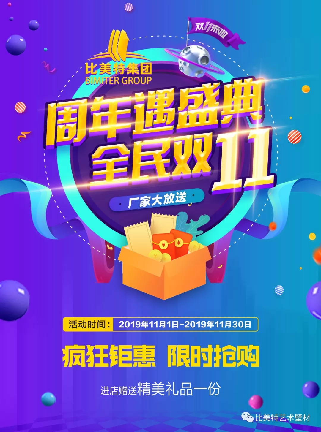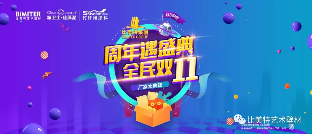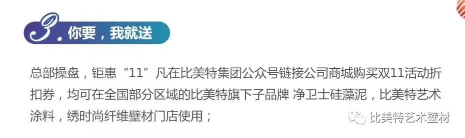 凡在比美特集团公众号链接公司商城购买双11活动折扣券,均可在全国部分区域的比美特旗下子品牌:净卫士硅藻泥,比美特艺术涂料,绣时尚纤维壁材门店使用。