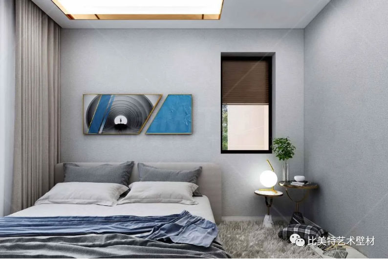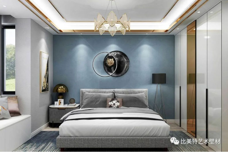 次卧延续客餐厅蓝与灰的搭配,简约的线条搭配金属材质的家居陈设,每一个看似简单的设计背后,让人在视觉和心灵上都享受到了一种极致优雅的生活态度。