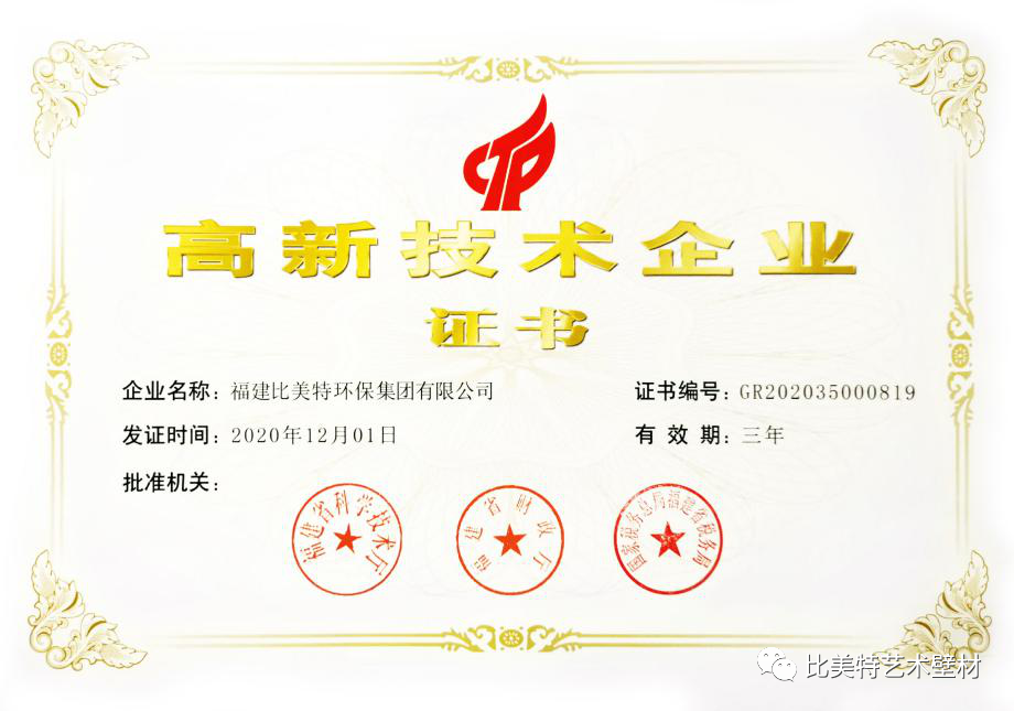2021新年伊始,在这生机勃发之际,作为艺术壁材行业领先企业比美特环保集团喜迎佳音,集团再次通过高新技术企业认定。