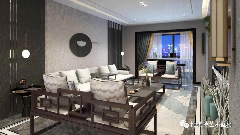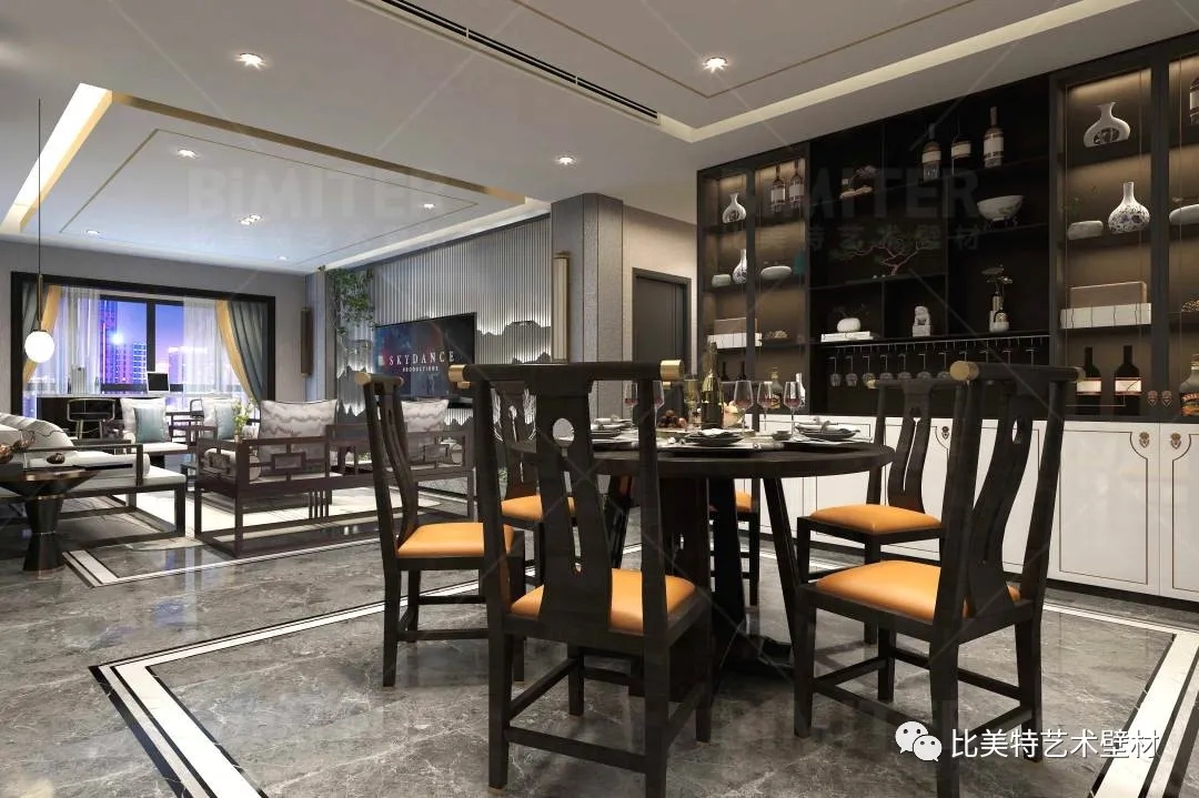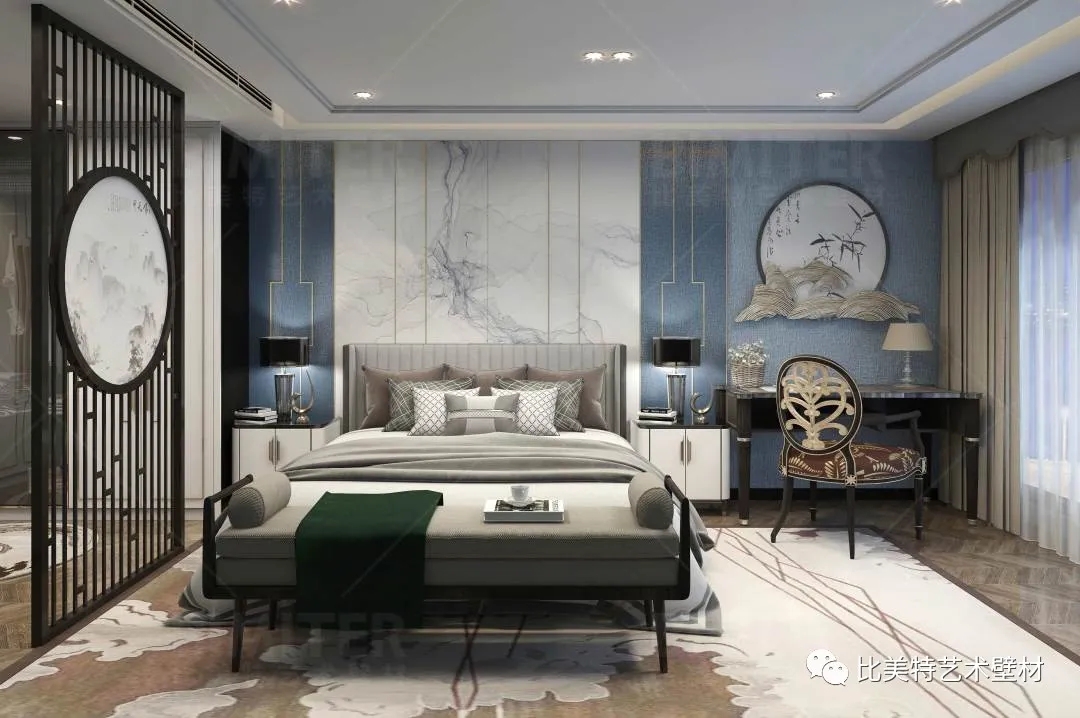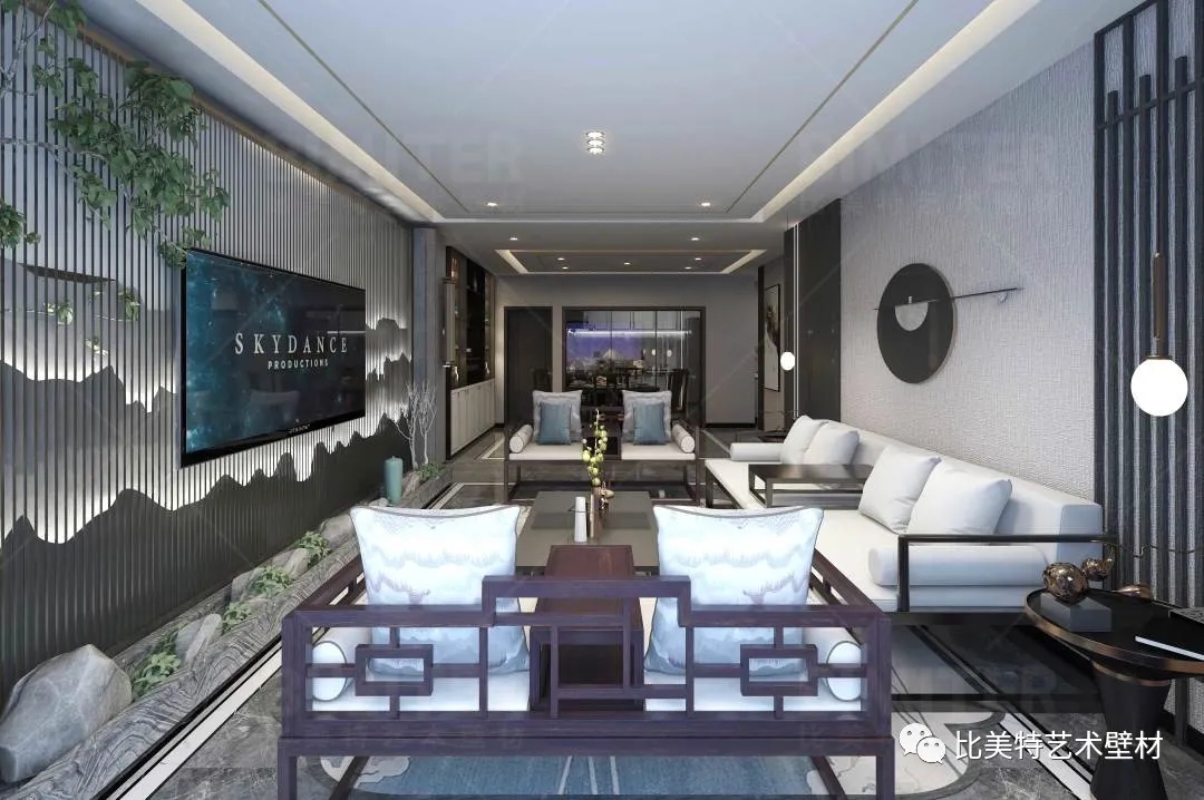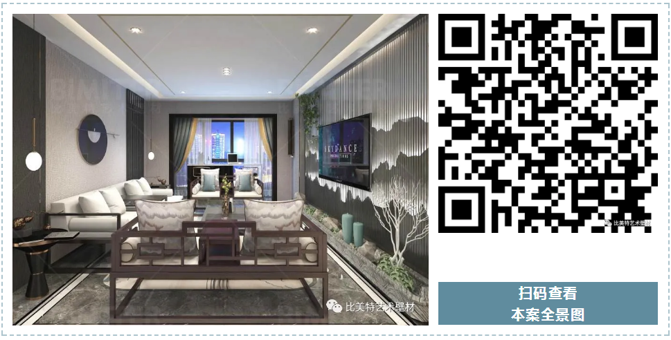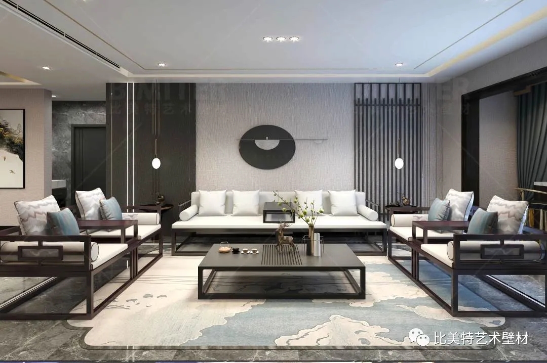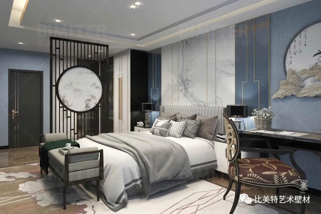 设计理念:本案整体风格为新中式风格辅以现代简约风,墙面采用比美特艺术壁材米兰风情系列,将经典布艺纹理渗入艺术涂料工艺中,让米兰时尚与艺术肌理相互交融,既保留了中国文化的韵味,又结合了当下流行风格的特色,为新中式风格注入了一股律动高雅的气息。