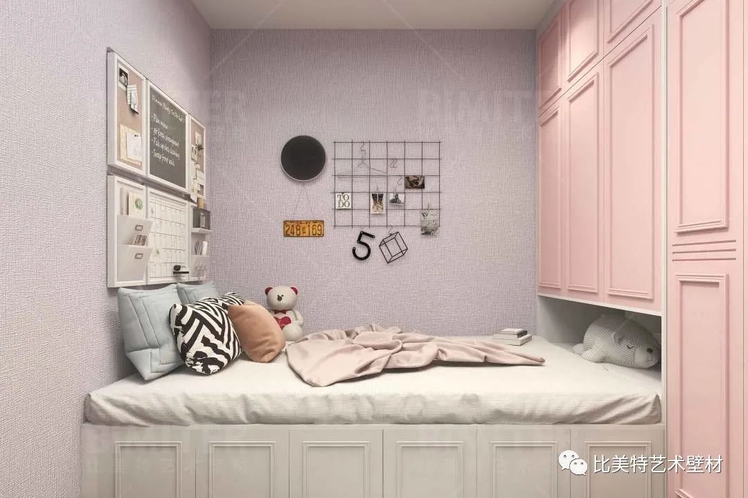 拒绝长大,保留纯真,每个小女孩几乎都对一间粉色系公主房毫无抵抗之力。粉色收纳柜与灰色墙面搭配,多彩的抱枕作为点缀空间的色彩。迷离的光线将静谧的光辉倾泻,淡淡地,隐约地,渲染出沉稳雅致的氛围。
