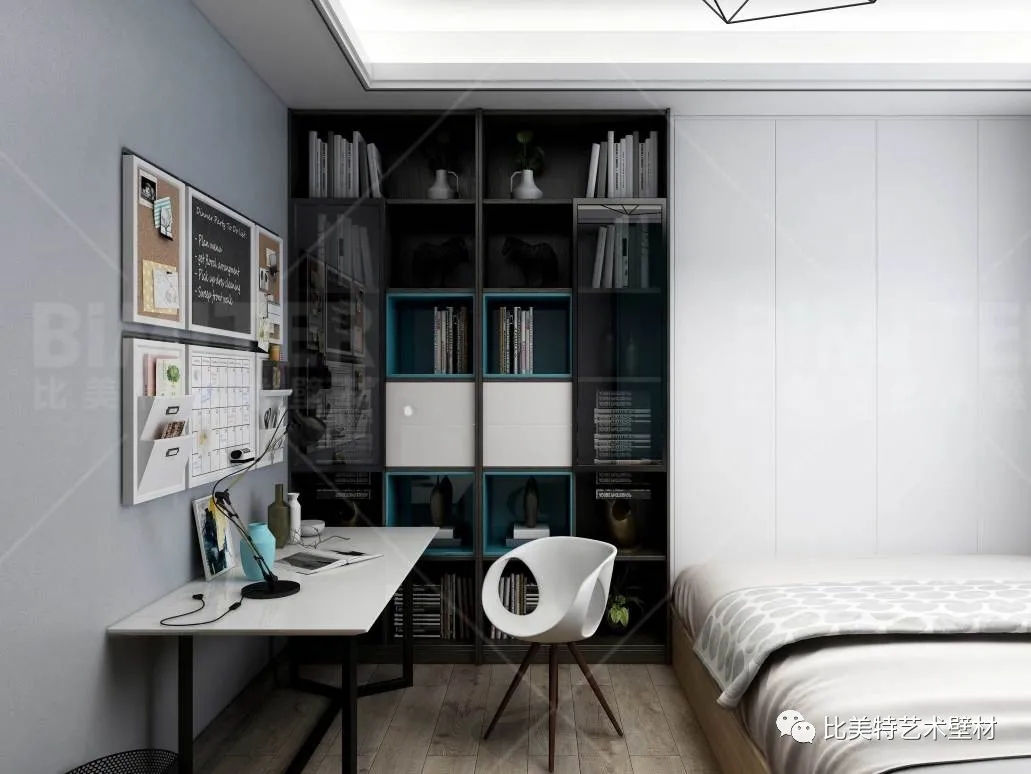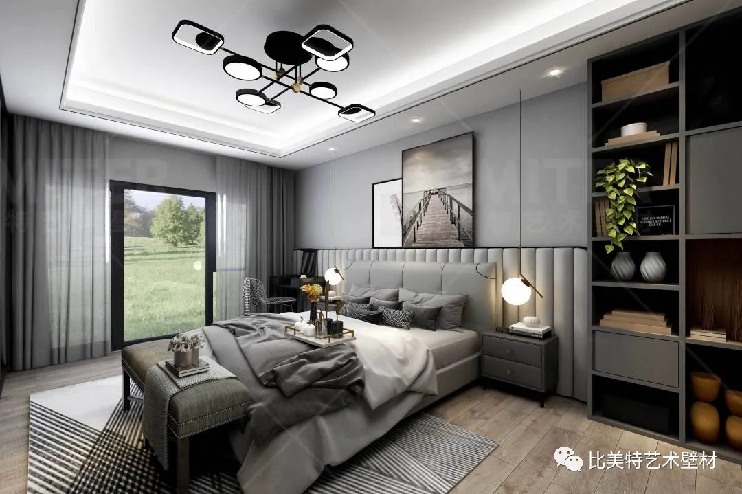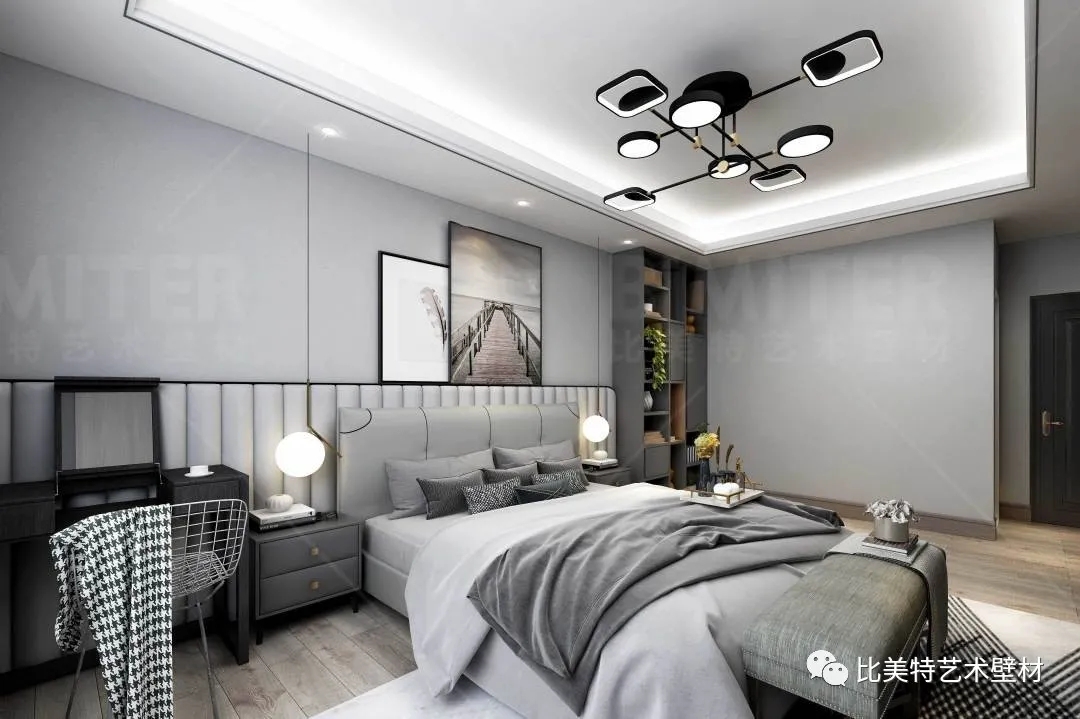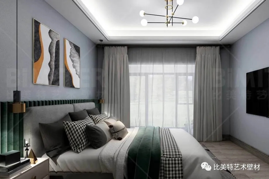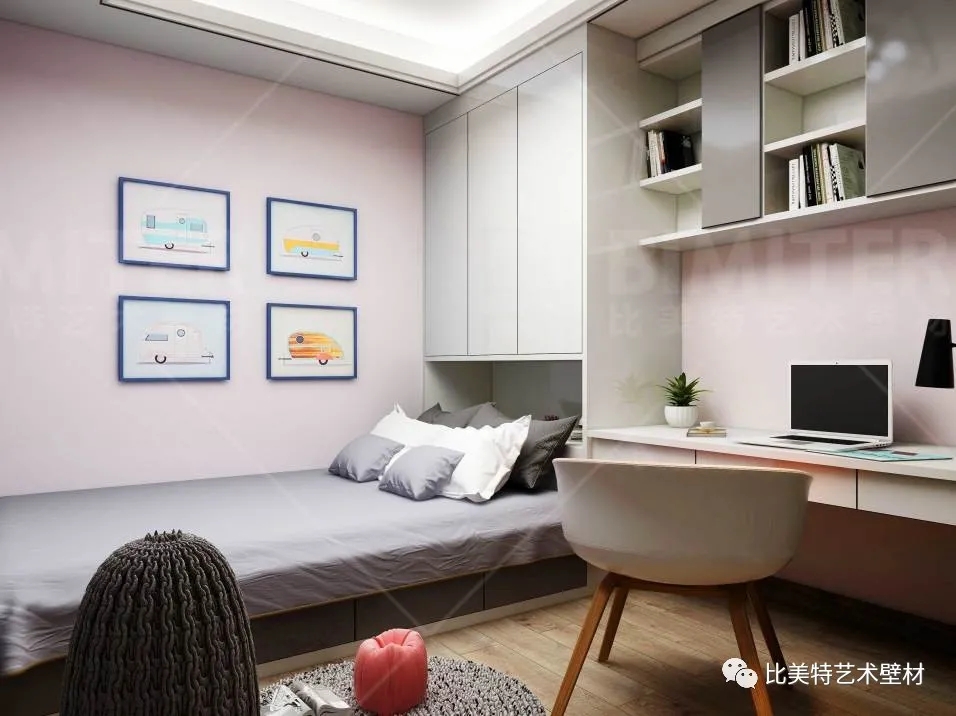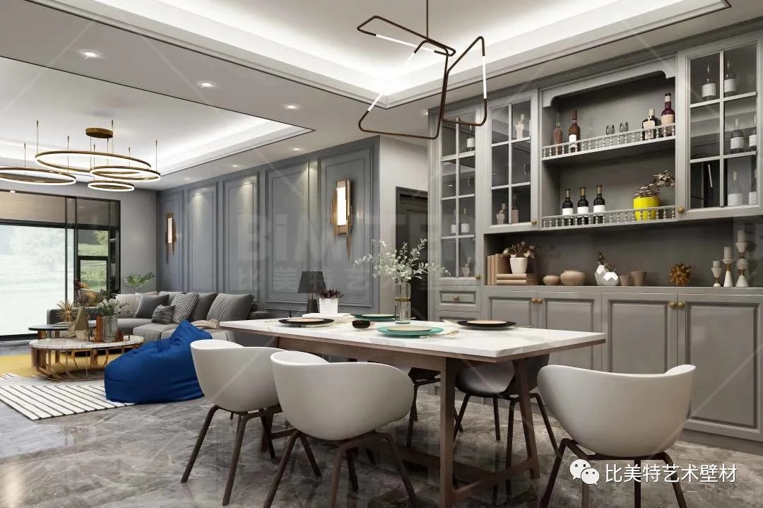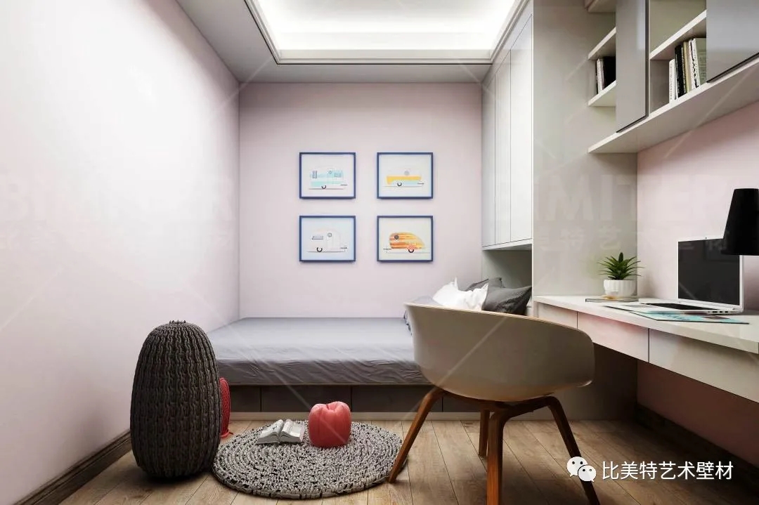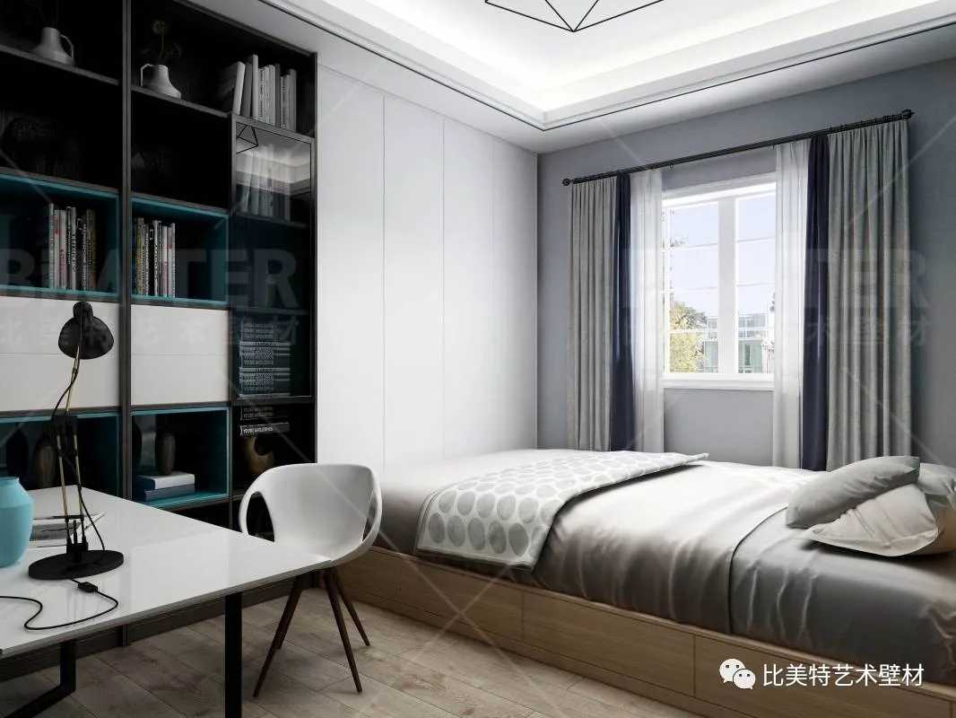 设计理念:本案整体风格为简美风格,以功能舒适为导向,空间做了合理细致的规划。墙面采用比美特艺术壁材克瑞斯净素系列,含蓄的磨砂纹理,纯色素雅的色彩,在灯光的照射下,闪耀着点点光泽。