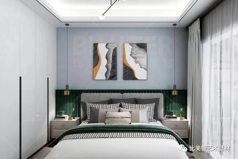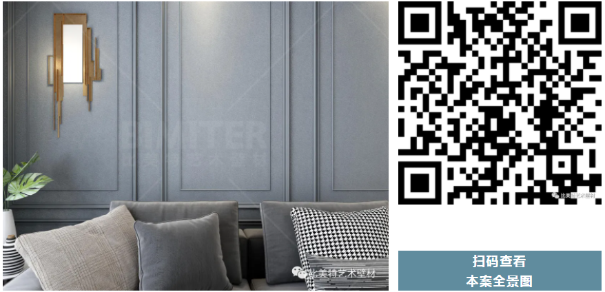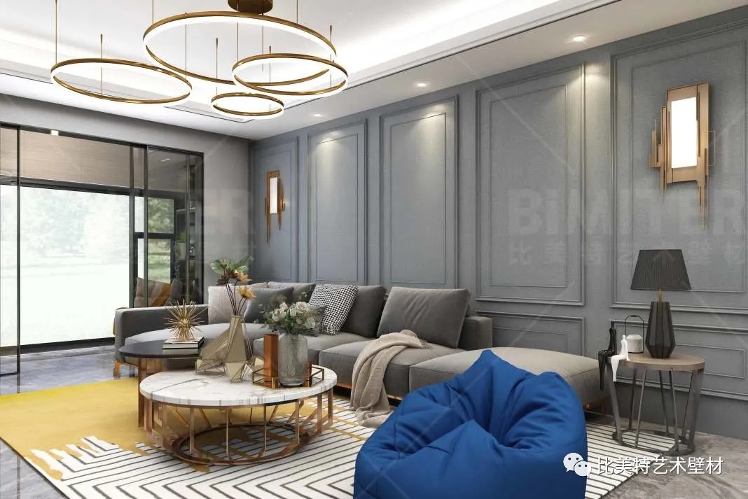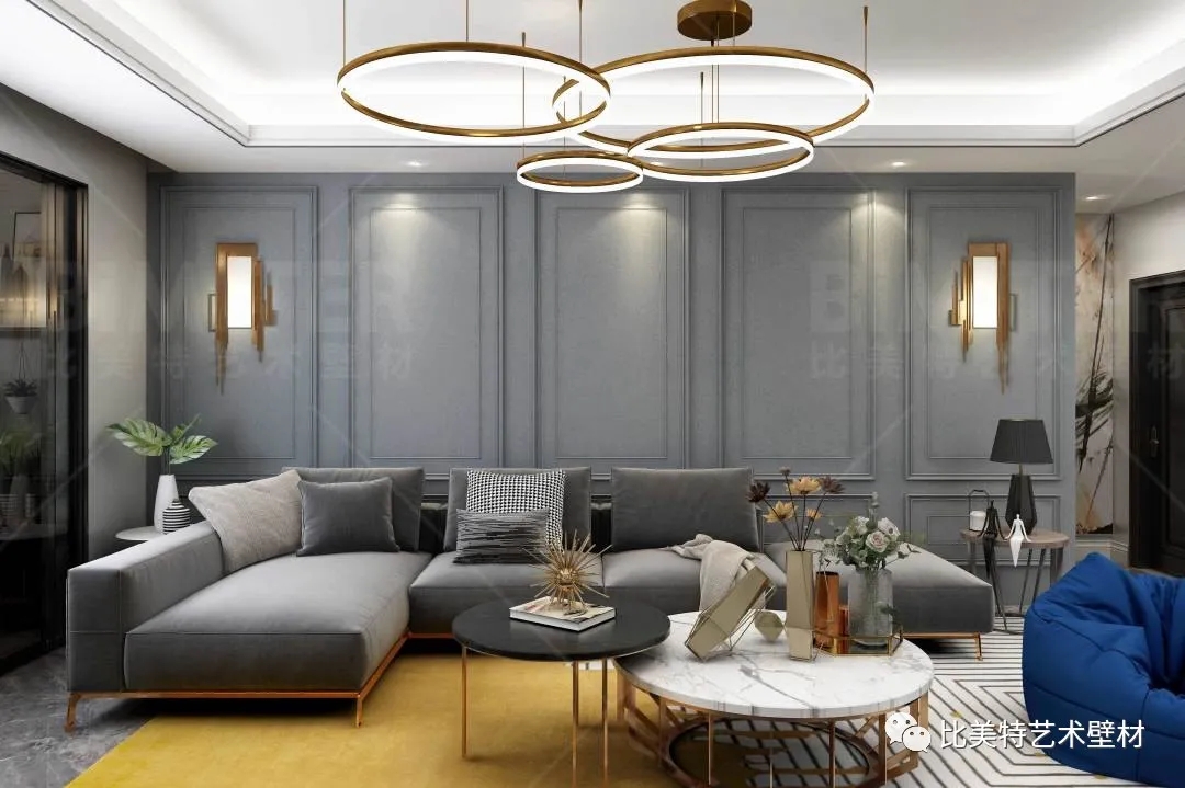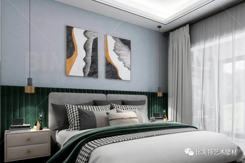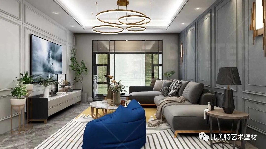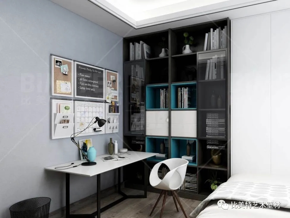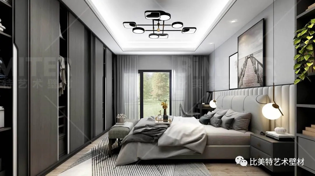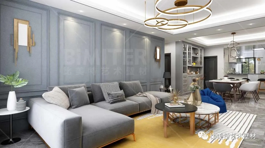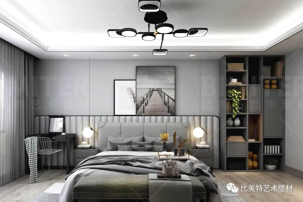 设计理念:本案整体风格为简美风格,以功能舒适为导向,空间做了合理细致的规划。墙面采用比美特艺术壁材克瑞斯净素系列,含蓄的磨砂纹理,纯色素雅的色彩,在灯光的照射下,闪耀着点点光泽。