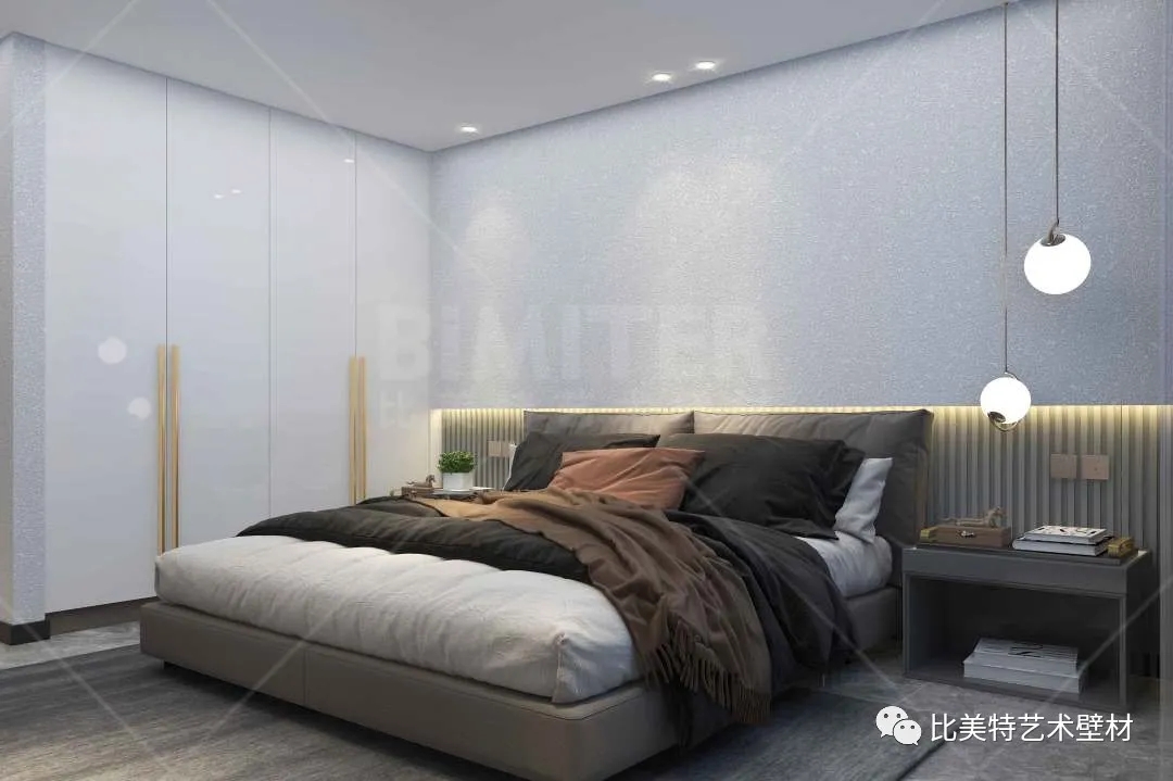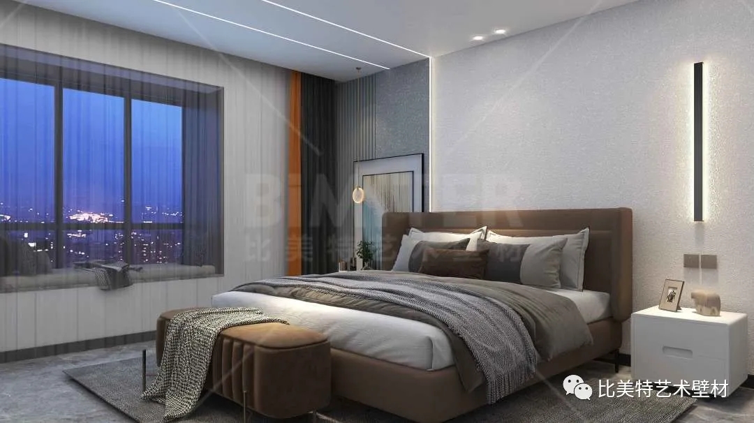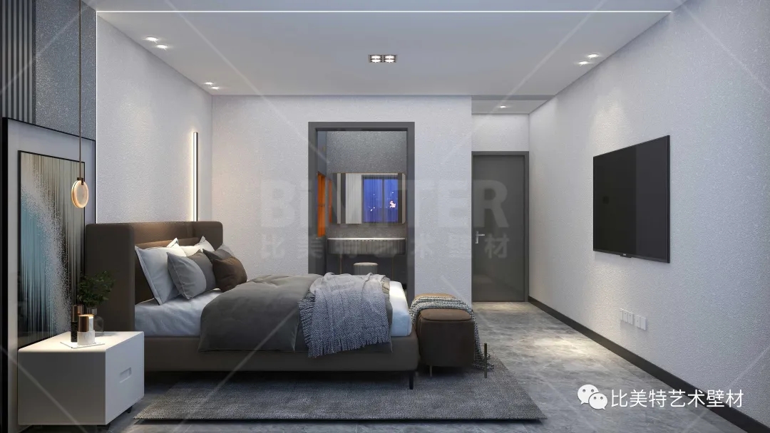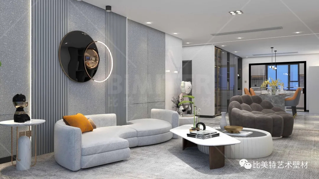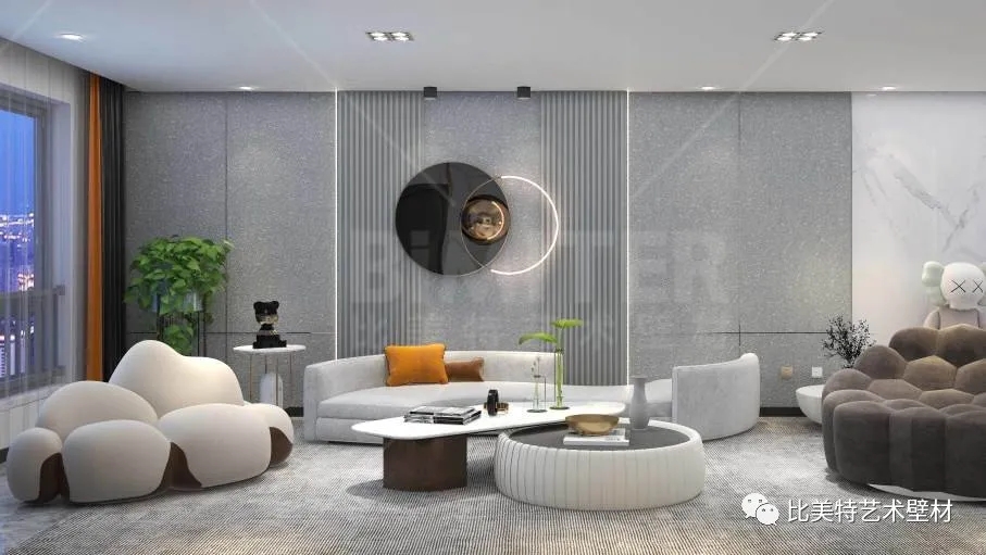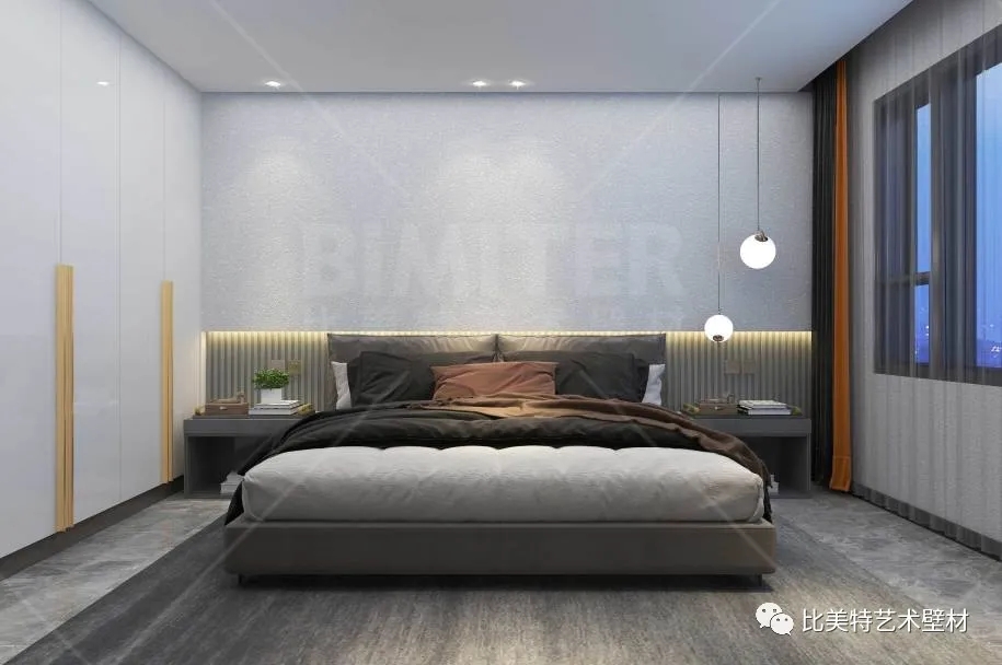 设计理念:本案整体风格为现代简约风,运用极简的线条去打造空间,墙面采用比美特艺术壁材典雅质感系列-柔和质感肌理工艺,清晰立体的纹理结合丝绸般平滑的质感,柔和的金属光泽搭配丰富的色彩,呈现出生机勃勃、形式多样的艺术空间。