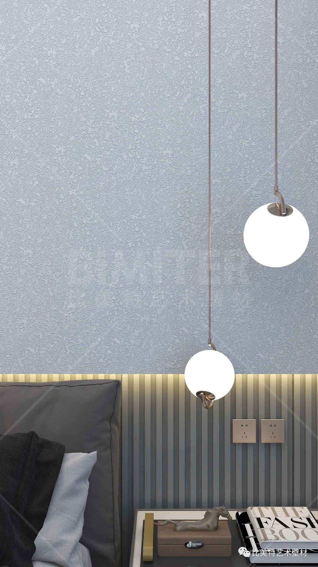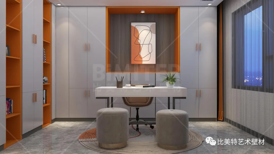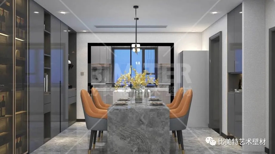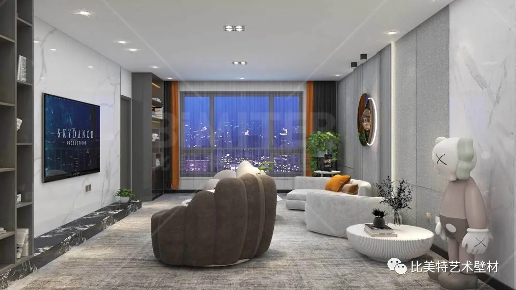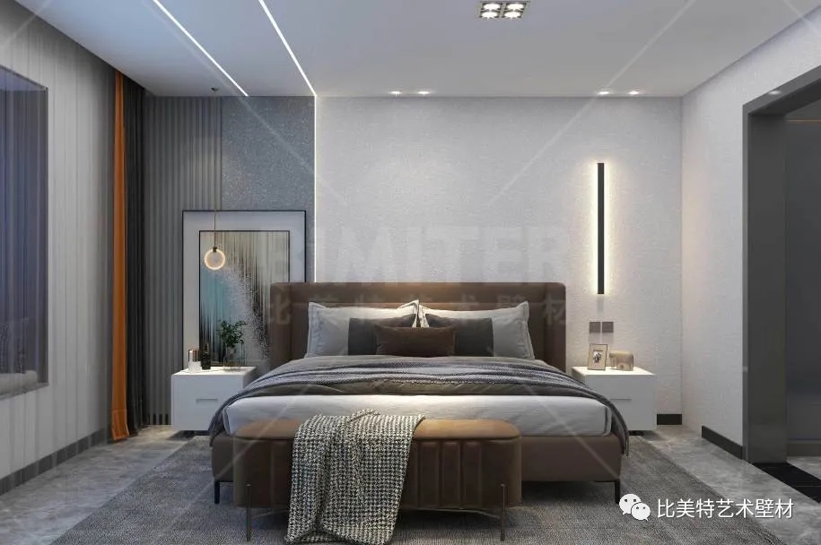 设计理念:本案整体风格为现代简约风,运用极简的线条去打造空间,墙面采用比美特艺术壁材典雅质感系列-柔和质感肌理工艺,清晰立体的纹理结合丝绸般平滑的质感,柔和的金属光泽搭配丰富的色彩,呈现出生机勃勃、形式多样的艺术空间。