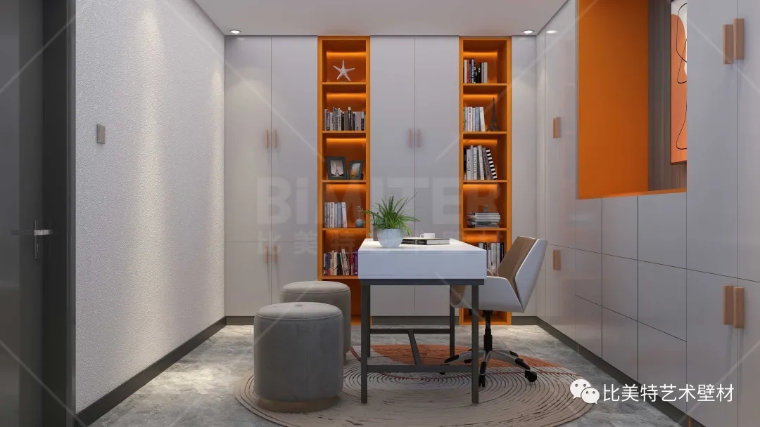 不是简单的“堆砌”和平淡的“摆放”,书房空间凝结着设计师的独具匠心,以暖橙色搭配灰色墙面,整体空间结构明确、简洁明快。