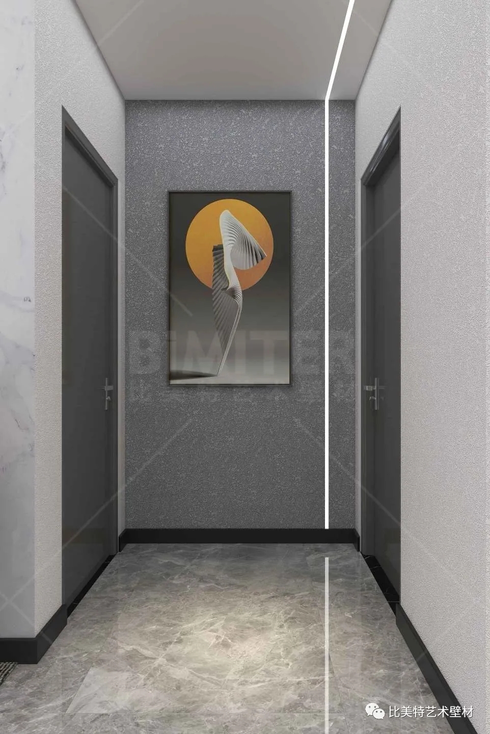过道在无主灯设计下,显得更加开阔明亮,以高级灰的艺术墙面搭配挂画,视觉上扩大了过道的空间,显得更加高端大气而不显沉闷。