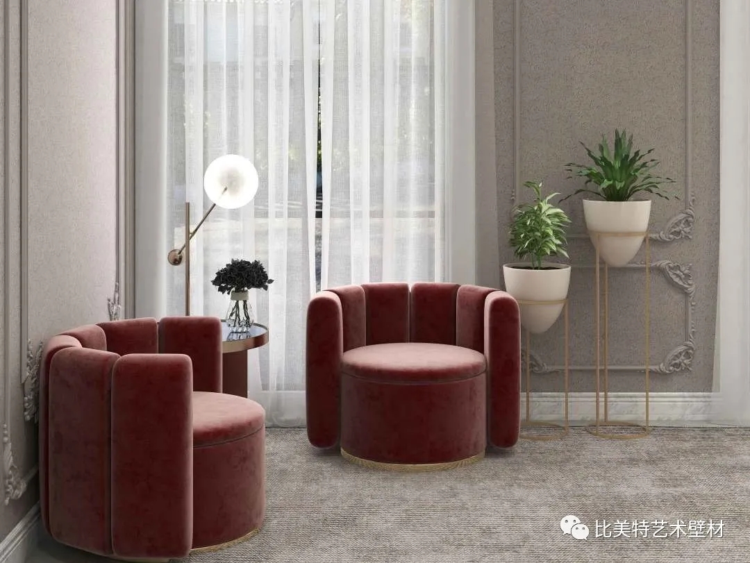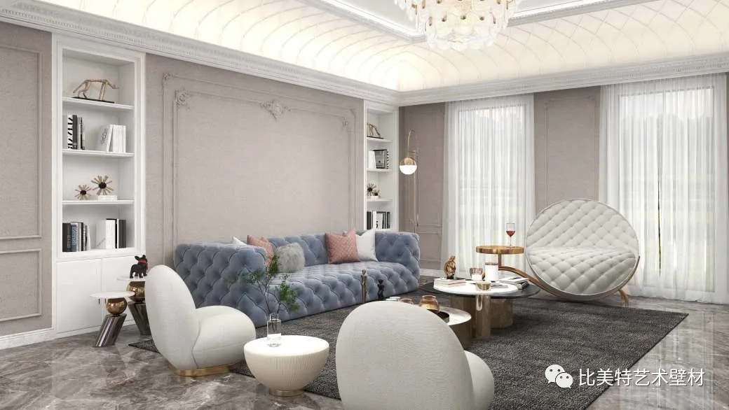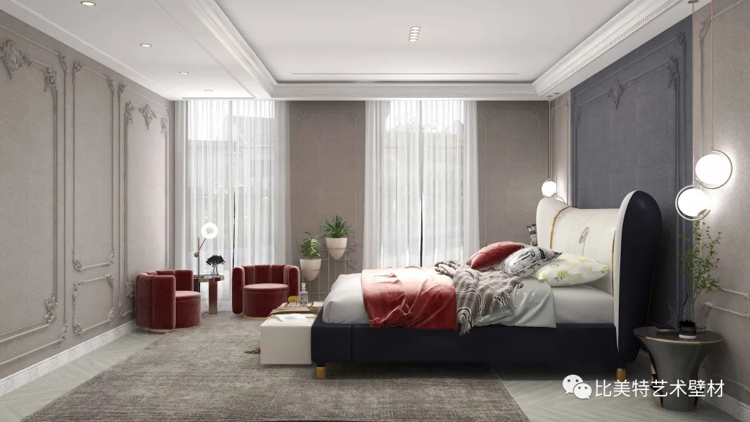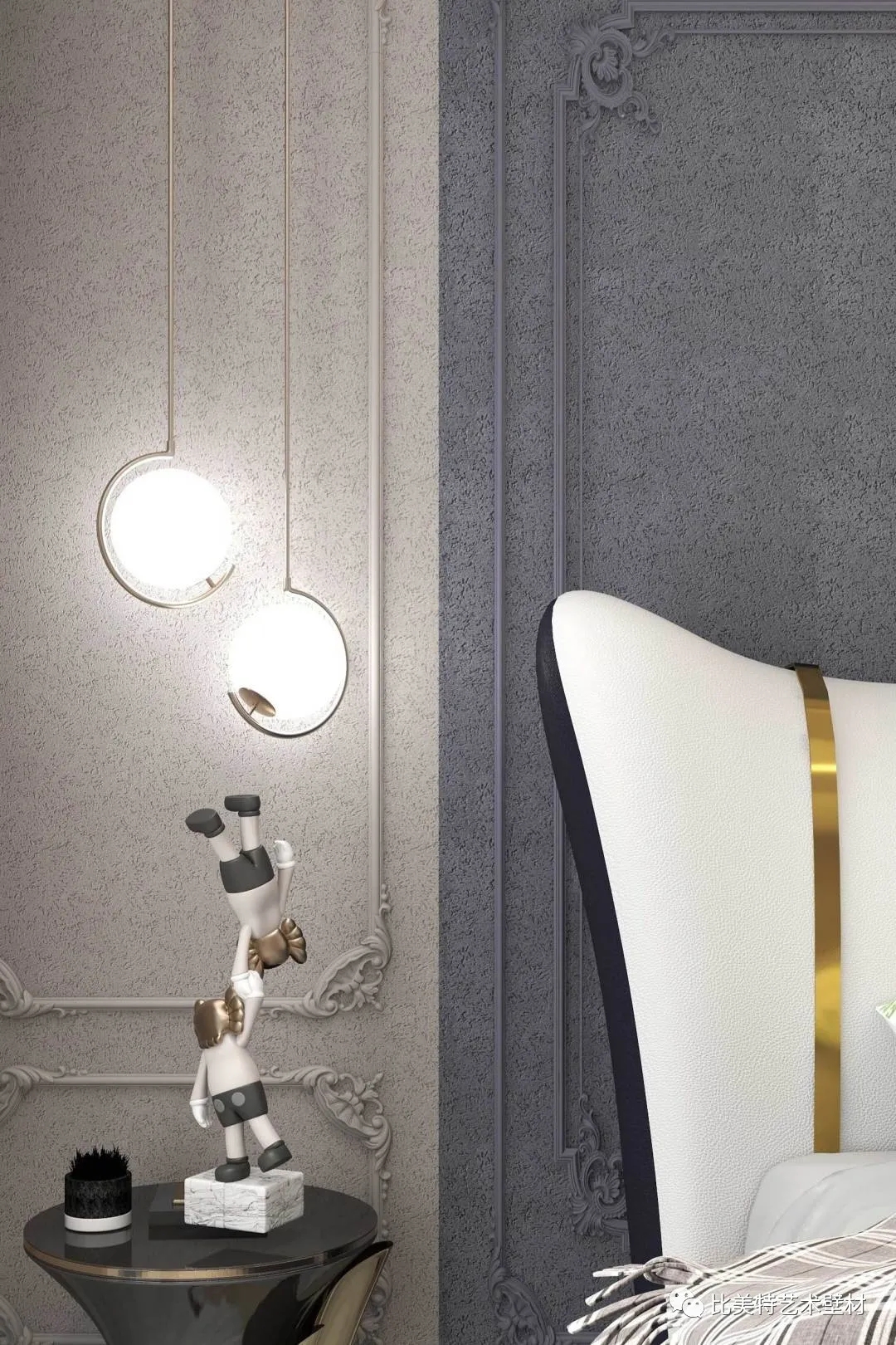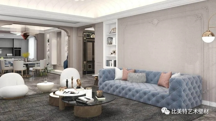 设计理念:本案整体风格以法式轻奢为主,墙面采用比美特艺术壁材爱丁堡系列,如洞石般古朴自然的爱丁堡纹理,组合使用了大理石、雕花、石膏线等欧式元素,细节处精雕细琢,既显现代舒适又不失法式浪漫复古感。