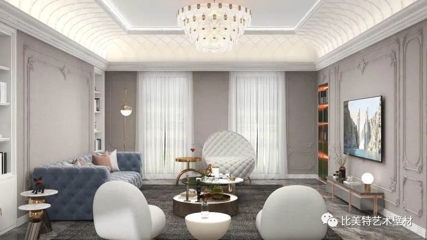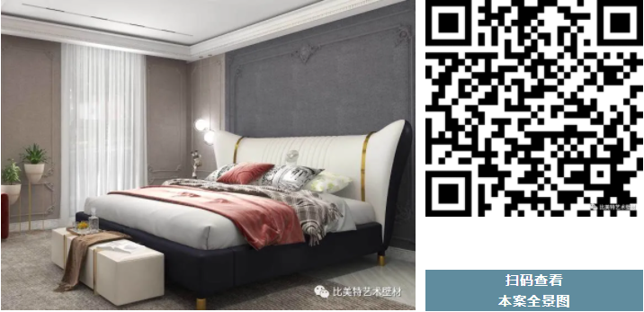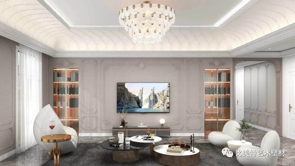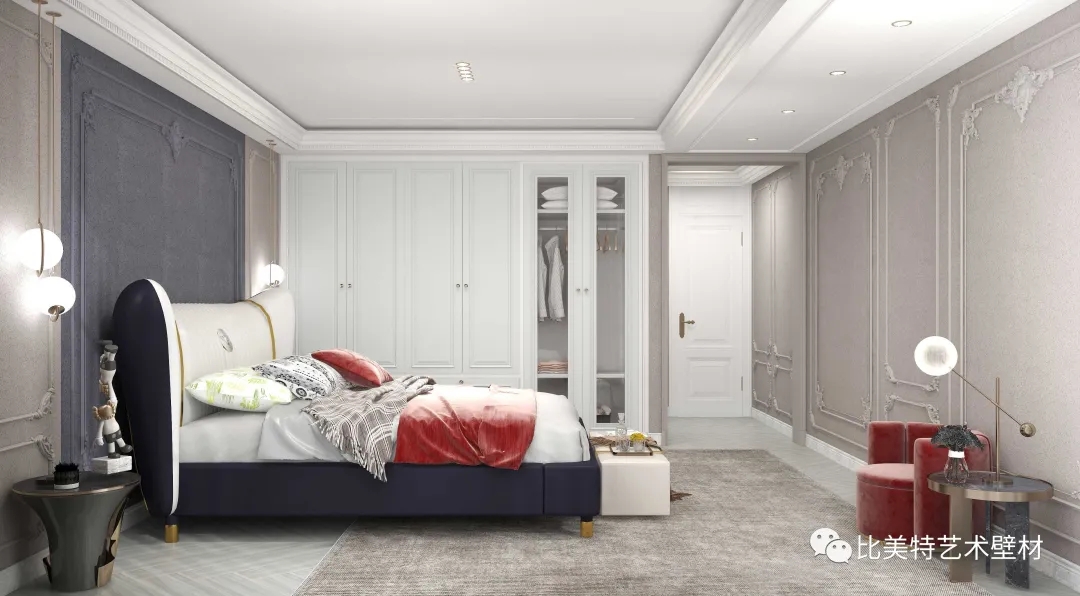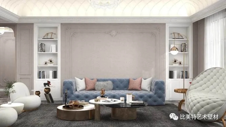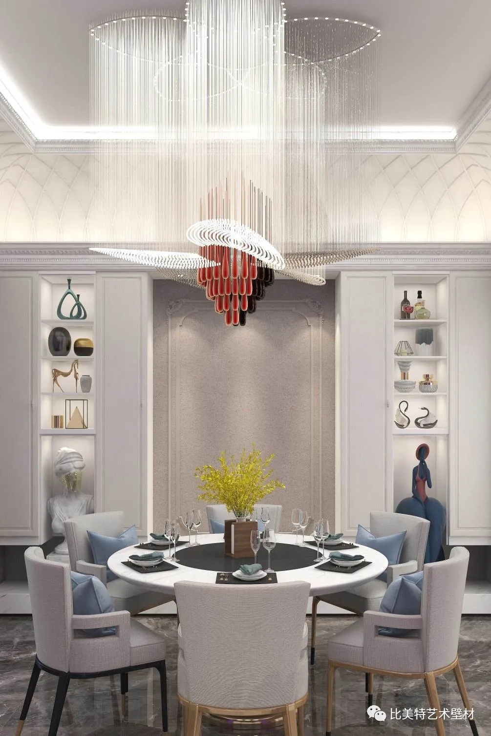 设计理念:本案整体风格以法式轻奢为主,墙面采用比美特艺术壁材爱丁堡系列,如洞石般古朴自然的爱丁堡纹理,组合使用了大理石、雕花、石膏线等欧式元素,细节处精雕细琢,既显现代舒适又不失法式浪漫复古感。