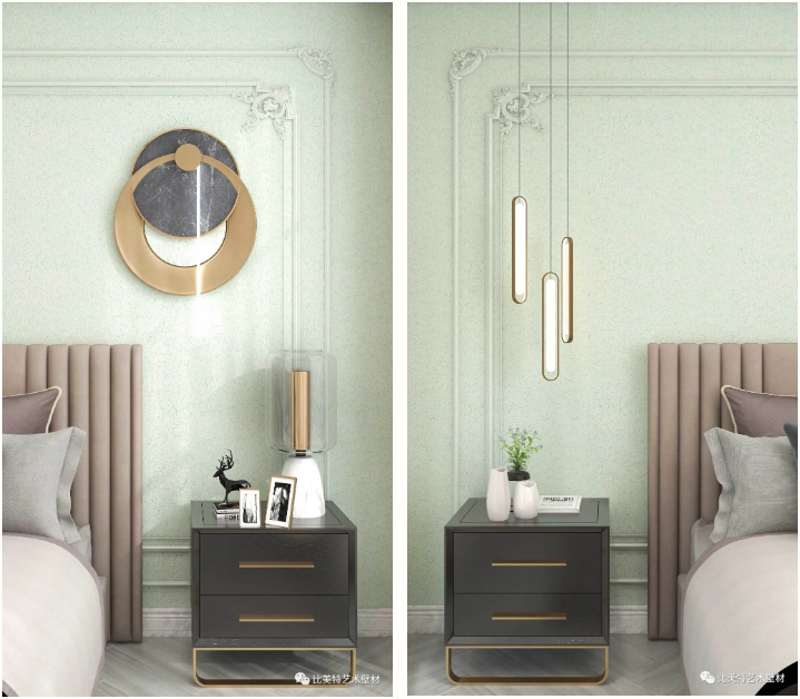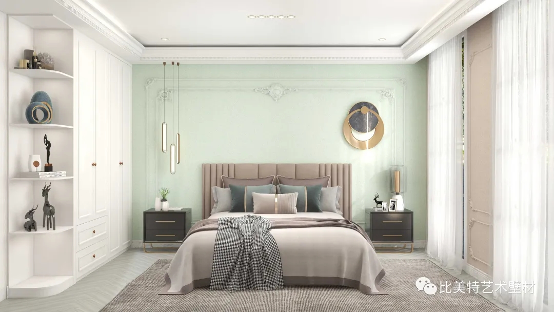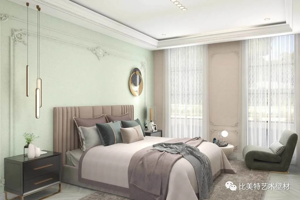次卧床头浅绿色背景墙上做了对称的石膏线设计,金属材质的墙面装饰使整个设计刚中带柔,也增加了法式轻奢的调性。
