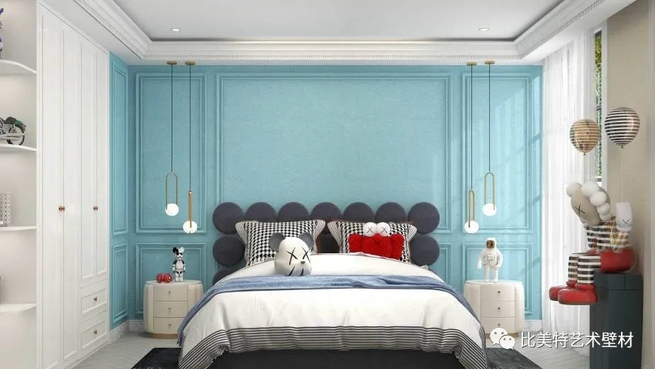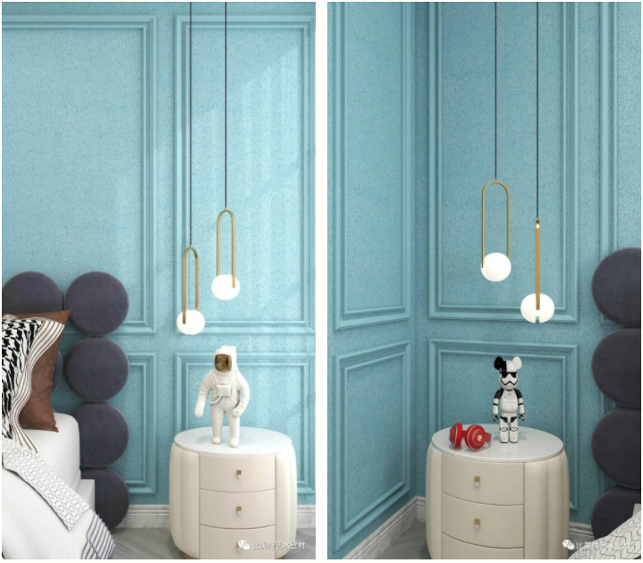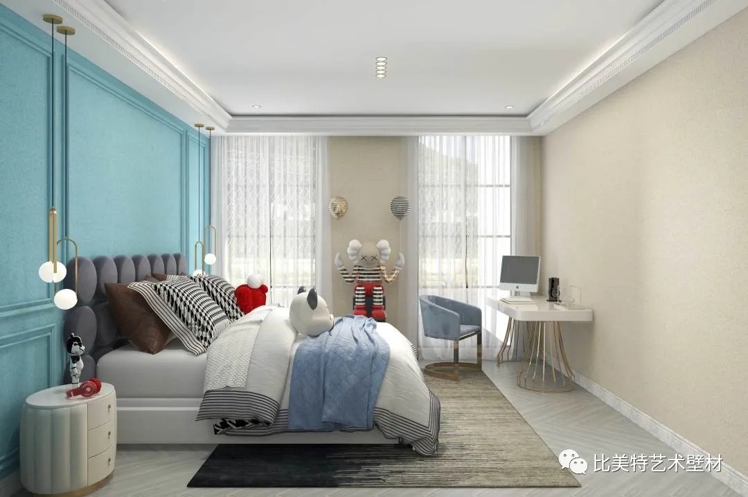 儿童房墙面米色与蓝色的搭配呈现出新奇活跃的视觉感,充满了温柔和纯真。金属质感的家具,创意的吊灯,彰显的是一种低调的法式浪漫情怀。