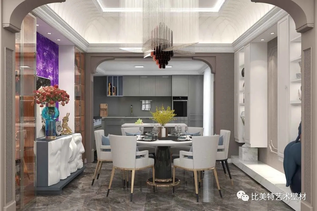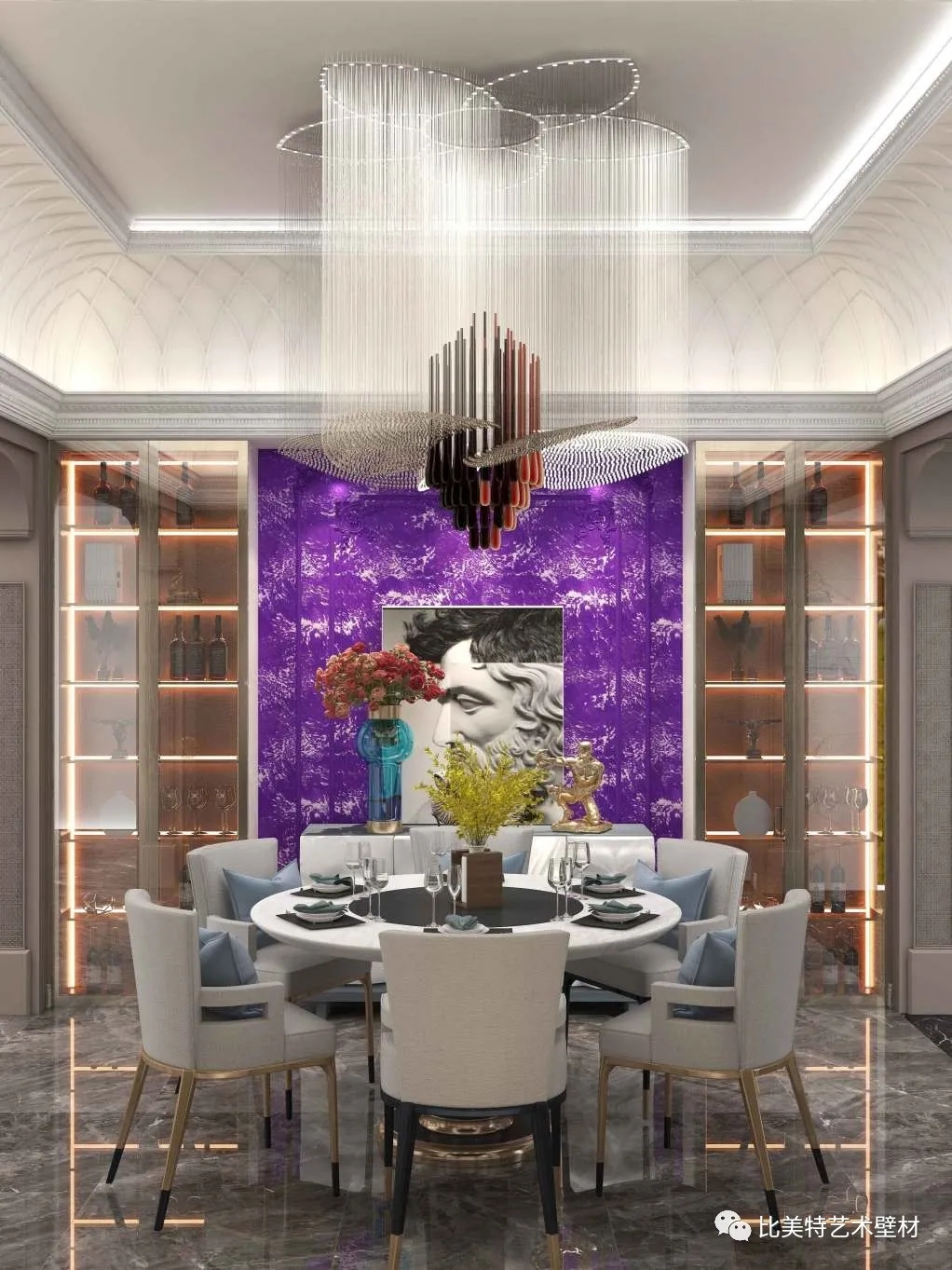 餐厅区域墙面除了使用爱丁堡高级灰色调外,加入了爱琴海炫紫工艺,使得整个空间更富有法式贵族阶层的浪漫和柔美。