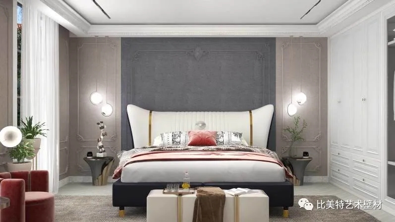 主卧墙面两种深浅色进行拼色,选用简洁石膏线条作为装饰,打造整个空间的古典氛围感。金属墙饰与摆件贵气而优雅,体现法式浪漫轻奢的韵味。