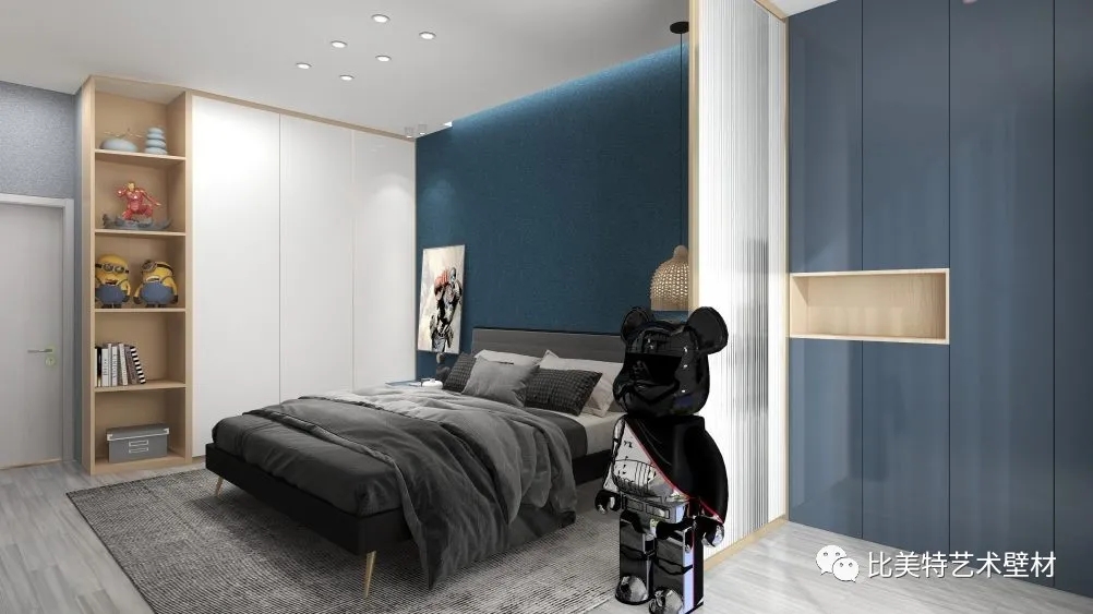 黑白灰床品搭配蓝色系墙面,整体空间配色简单却又各有调性,自由通透的布局。将美与空间结合,打造高颜值家居环境,实现侘寂之美。