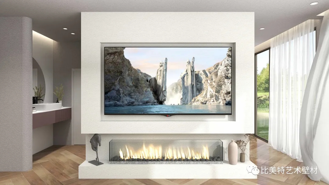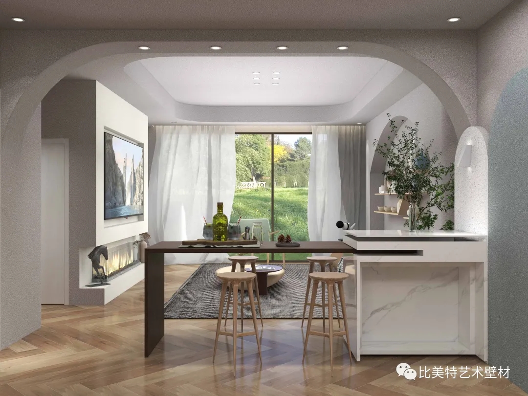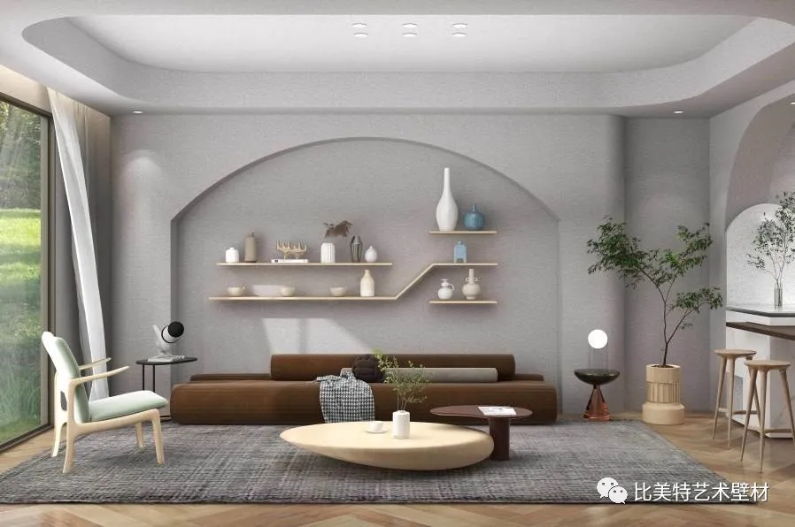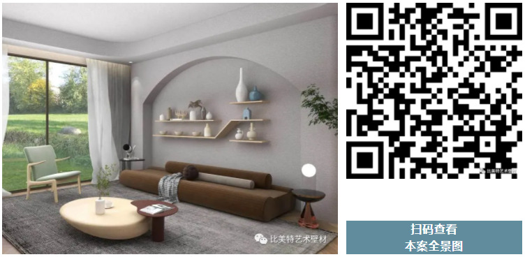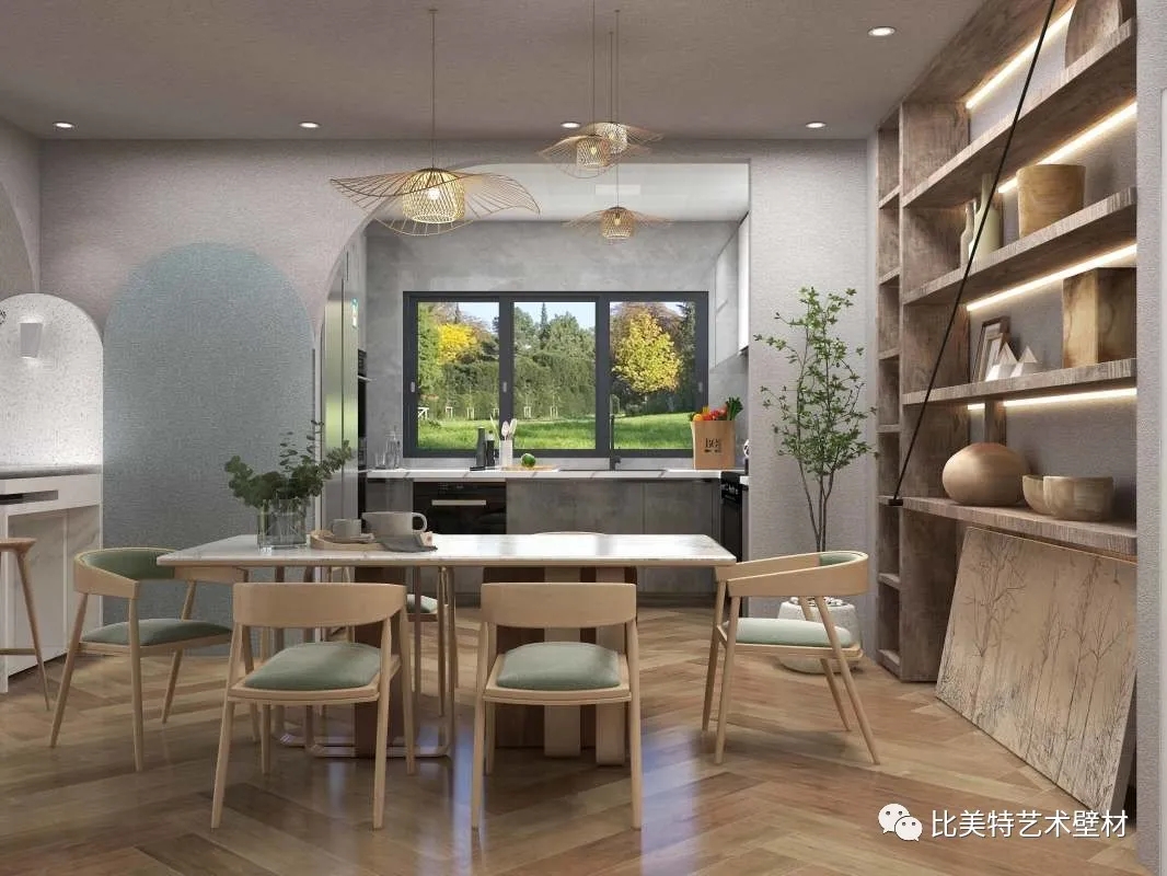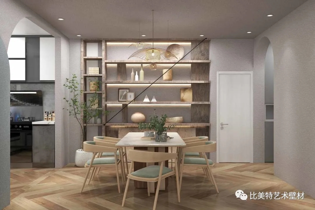 设计理念:本案整体风格以侘寂风为主,墙面采用比美特艺术壁材贝壳彩片系列都灵迷彩,恰到好处的复合色彩与不规则的自然纹理,搭配侘寂风,给予人们时尚大方而又极具个性的、否定世俗赋予的美学含义的艺术美感,产生出一种质朴淡泊的美。