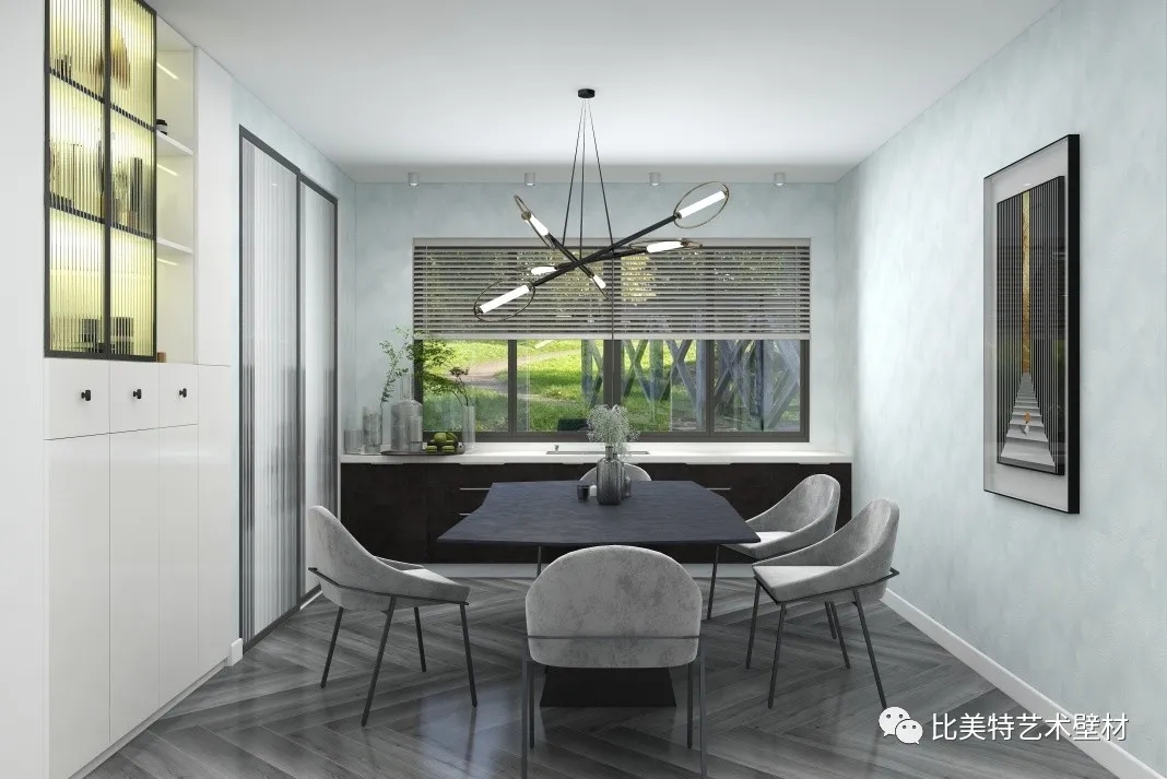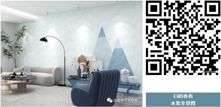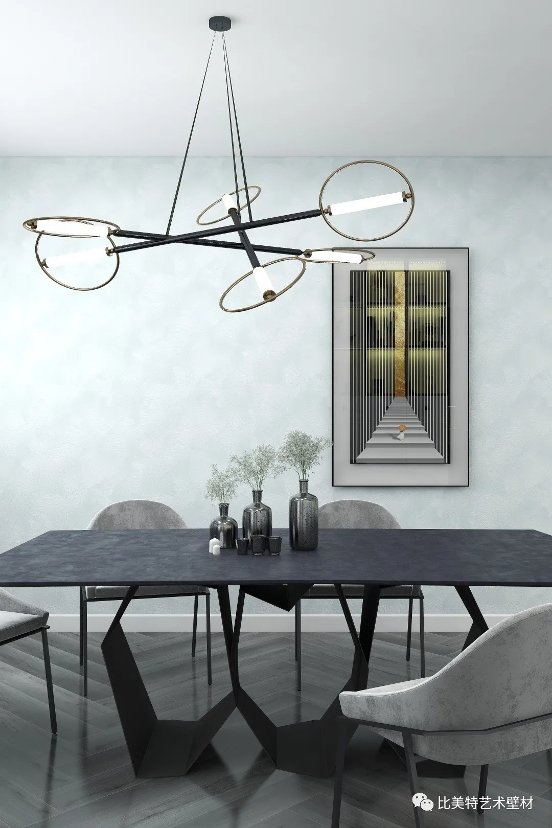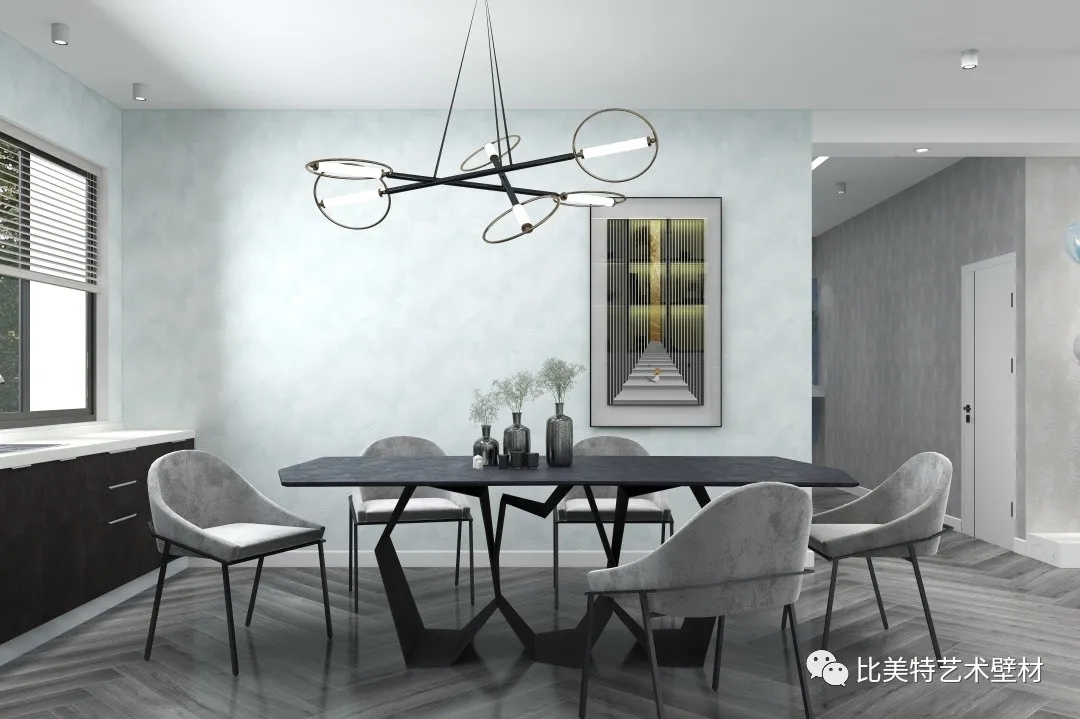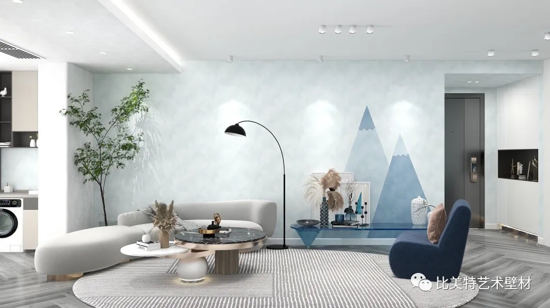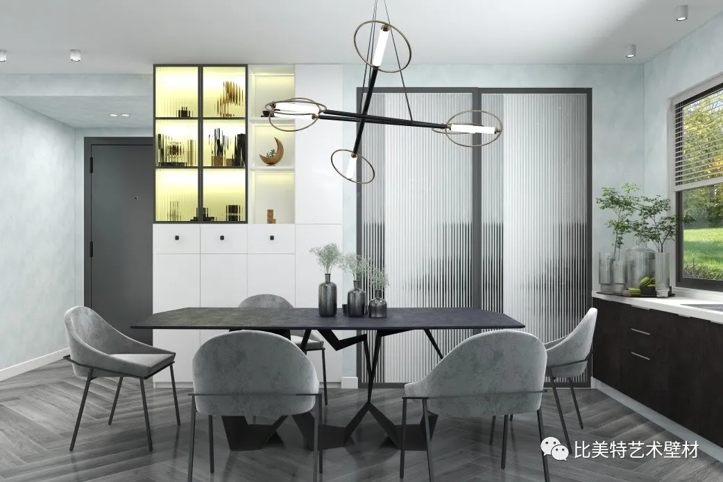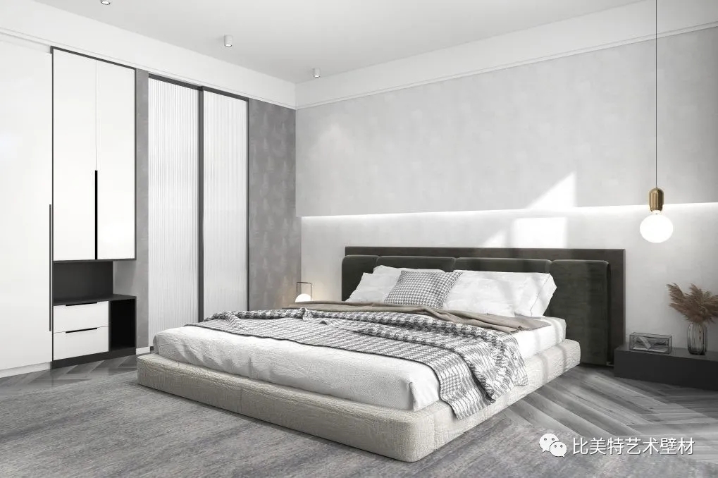 设计理念:本案整体风格以现代简约为主,墙面采用比美特艺术壁材晶钻系列布斯卡工艺,丝绒般闪耀的光泽结合流畅的纹理,搭配现代简约风格,让整个空间都显得简洁优雅而又美观。