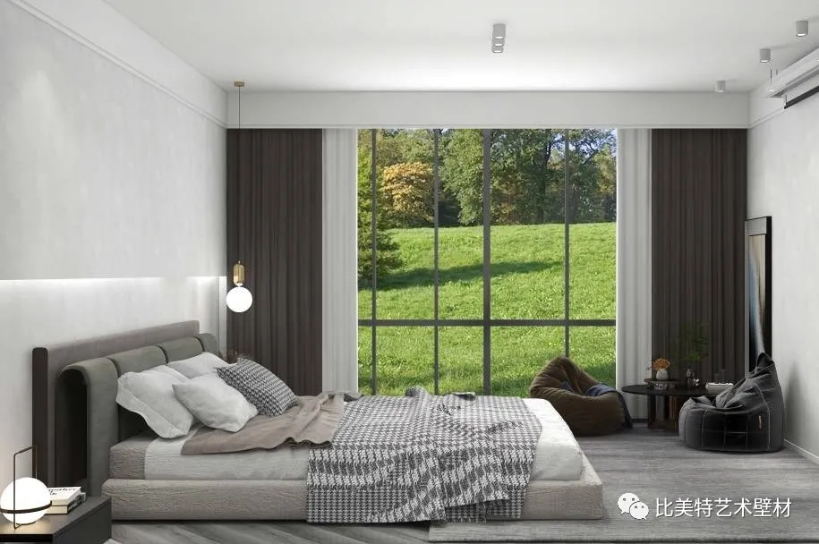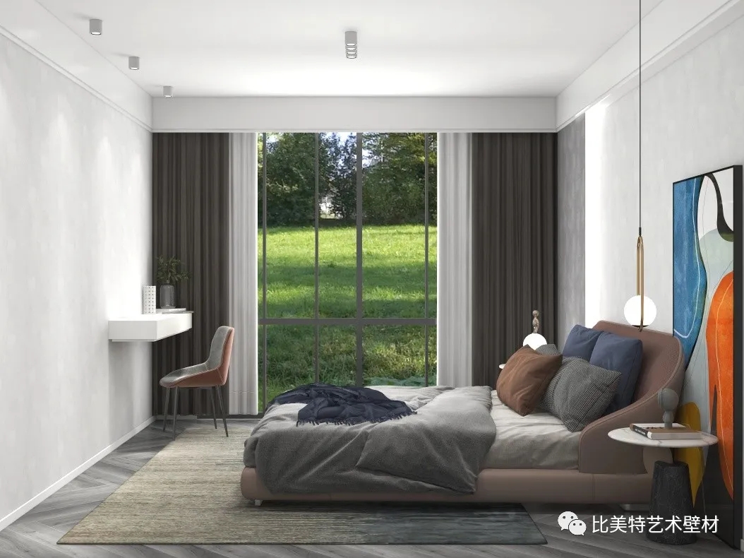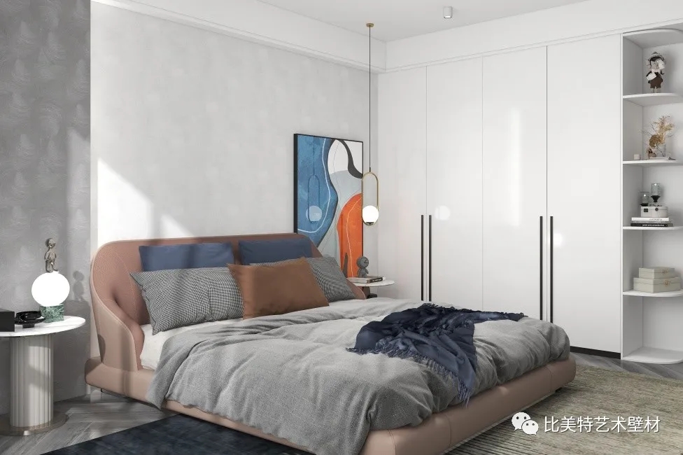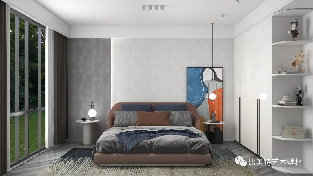 次卧背景墙以布斯卡深浅灰拼色的墙面打破空间,以现代舒适的格调基础,布置轻松雅致的家具,呈现出一种现代舒适而又优雅从容的气质。