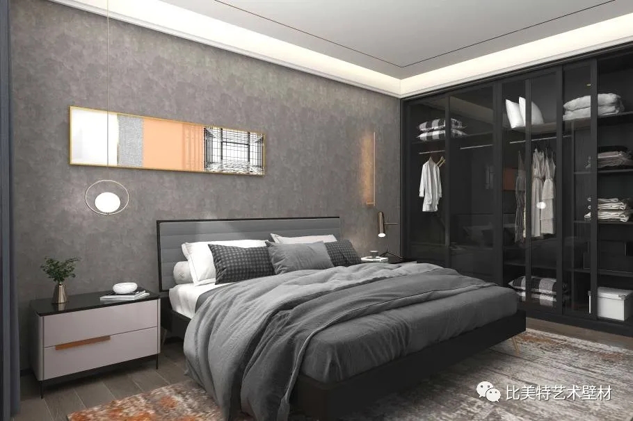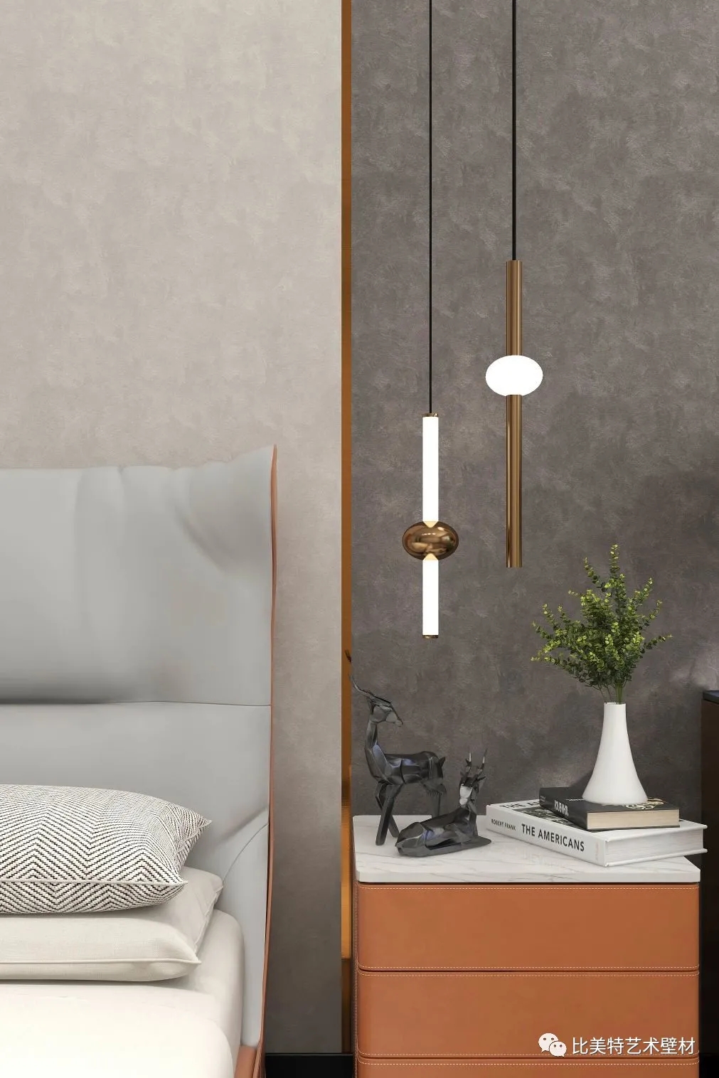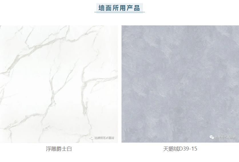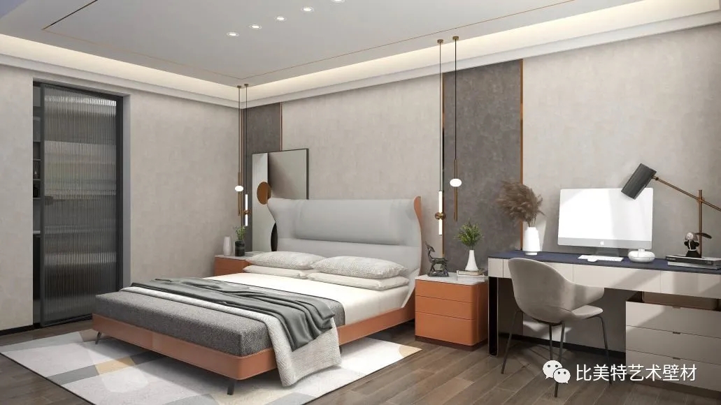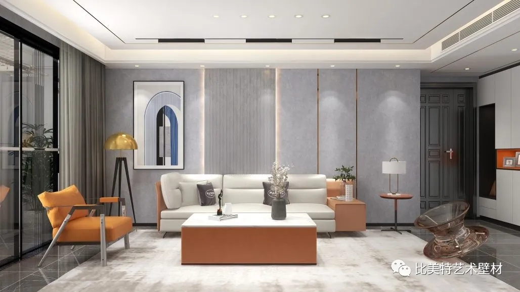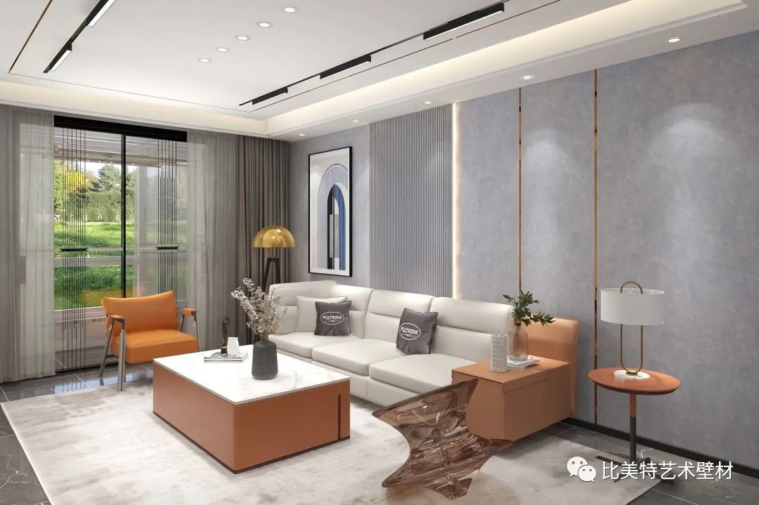 设计理念:本案整体风格以现代轻奢为主,墙面采用比美特艺术壁材天鹅绒系列。珍珠般的光泽与丝绒柔滑的质感相结合,纹理又似天鹅的羽毛般细腻舒适,搭配现代轻奢风,打造现代都市的简单格调却又不失高级感。