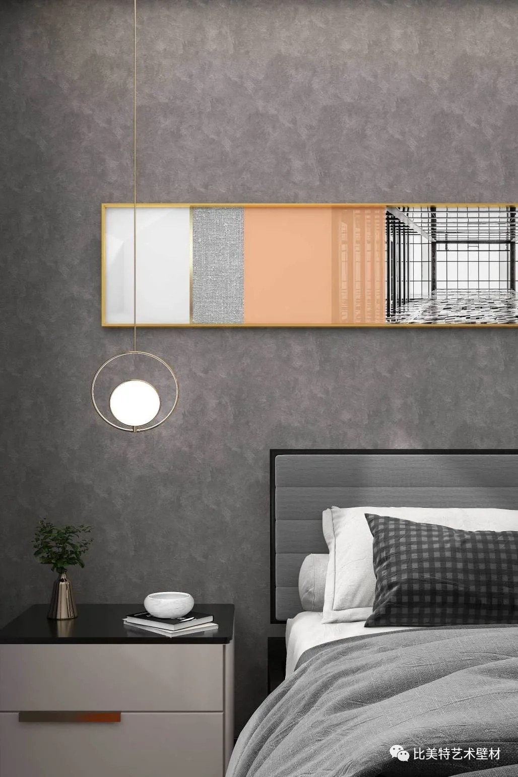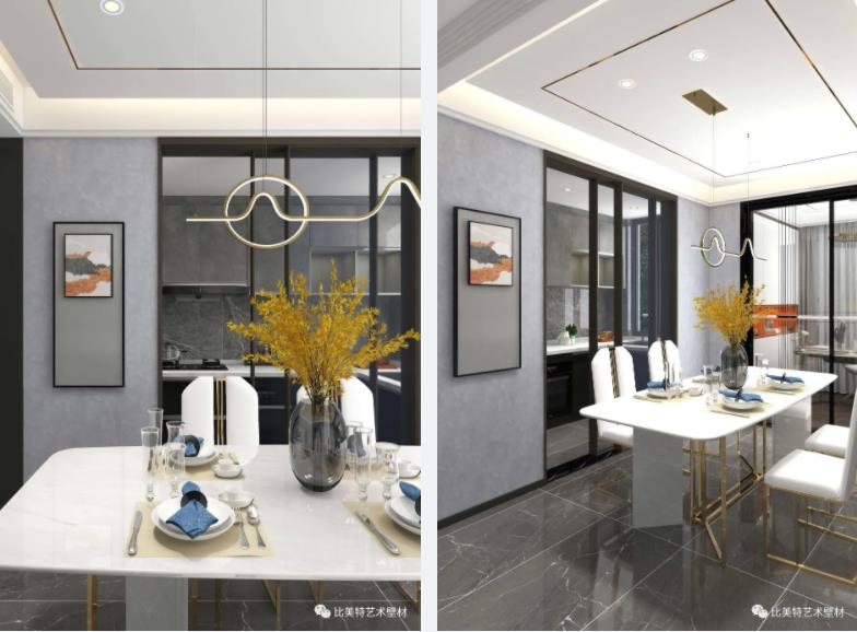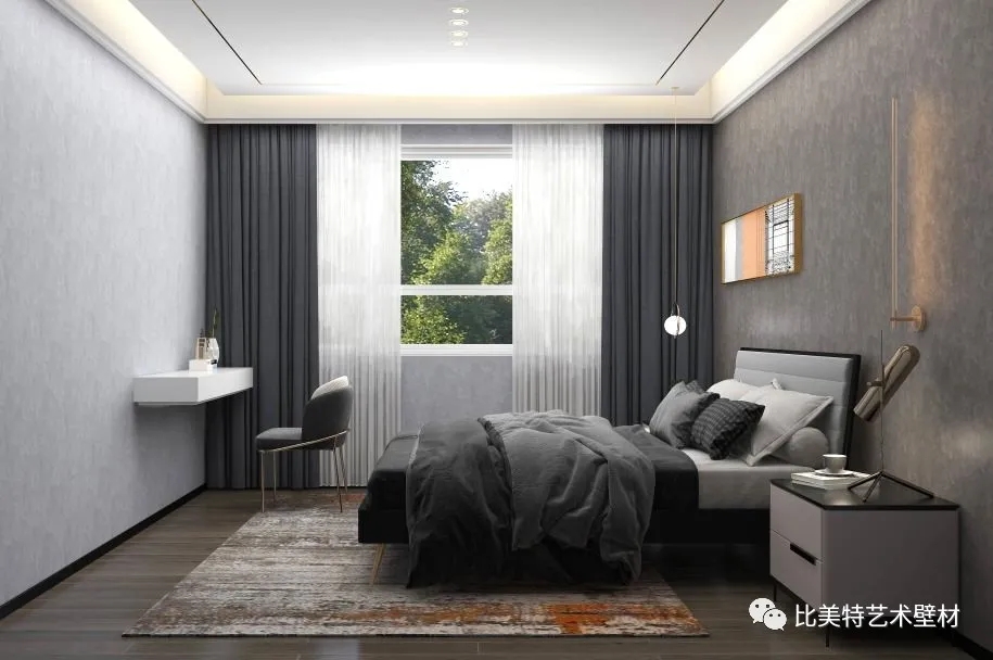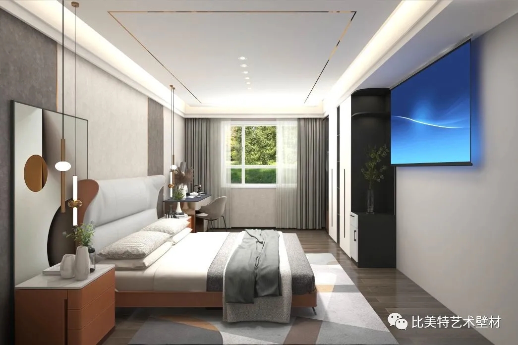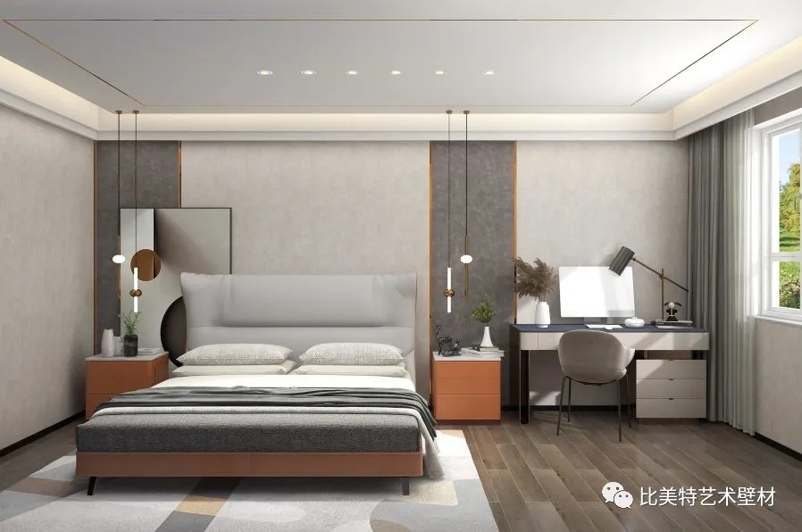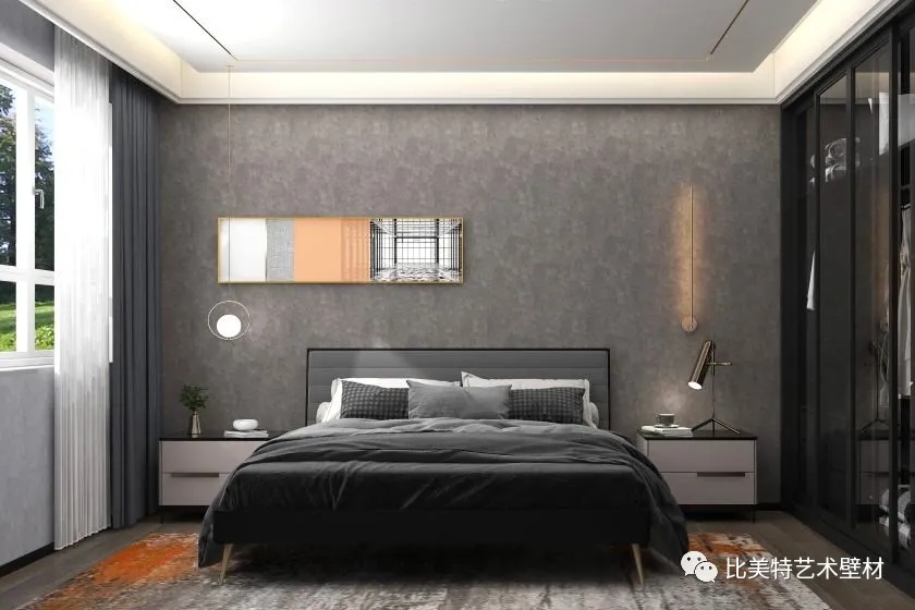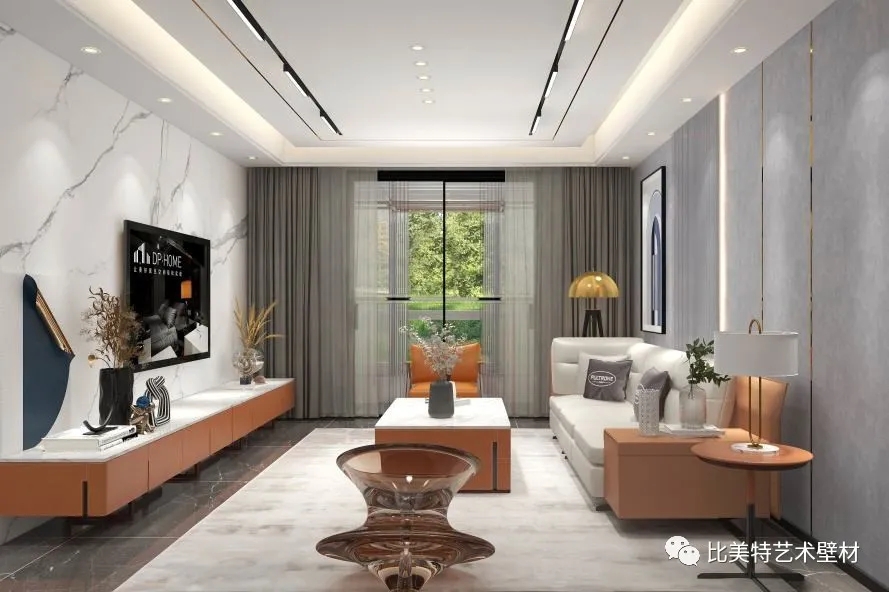 设计理念:本案整体风格以现代轻奢为主,墙面采用比美特艺术壁材天鹅绒系列。珍珠般的光泽与丝绒柔滑的质感相结合,纹理又似天鹅的羽毛般细腻舒适,搭配现代轻奢风,打造现代都市的简单格调却又不失高级感。