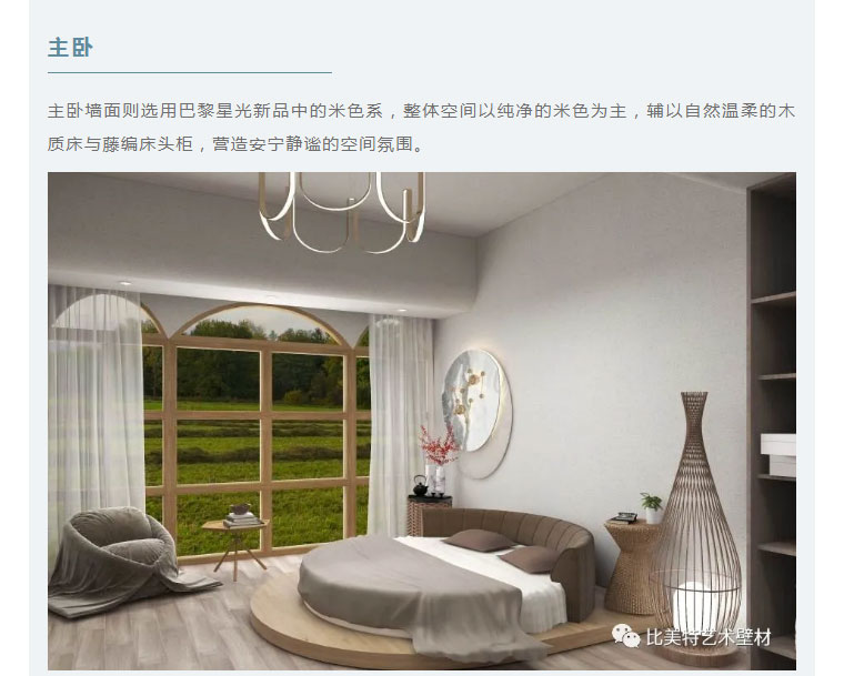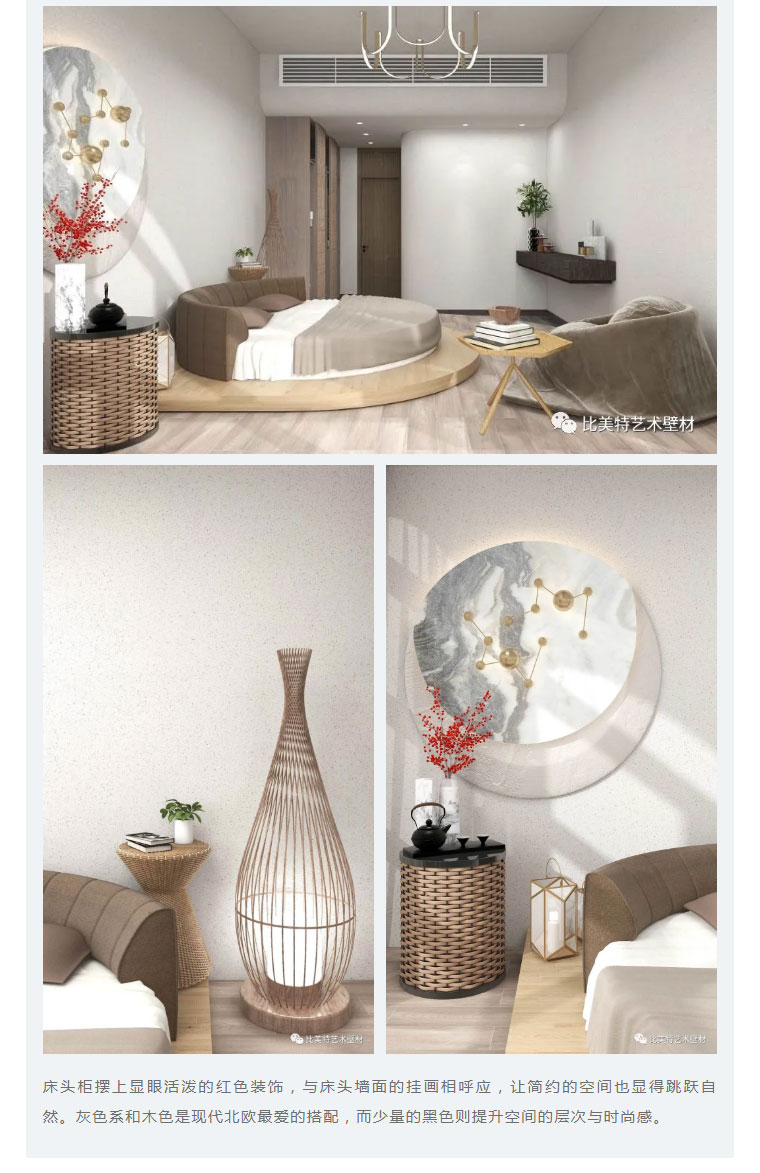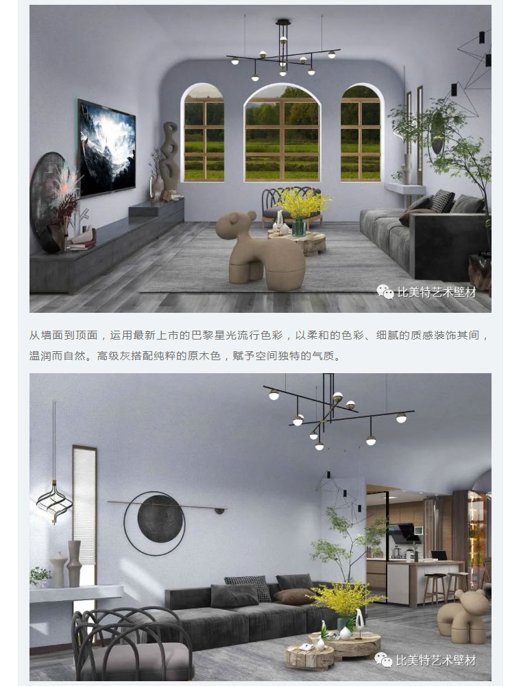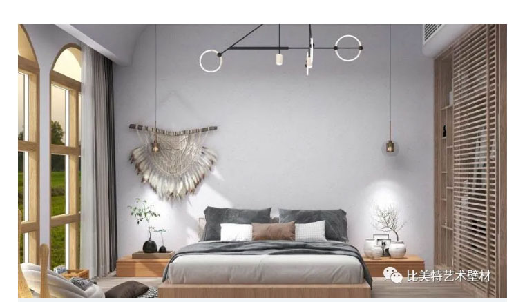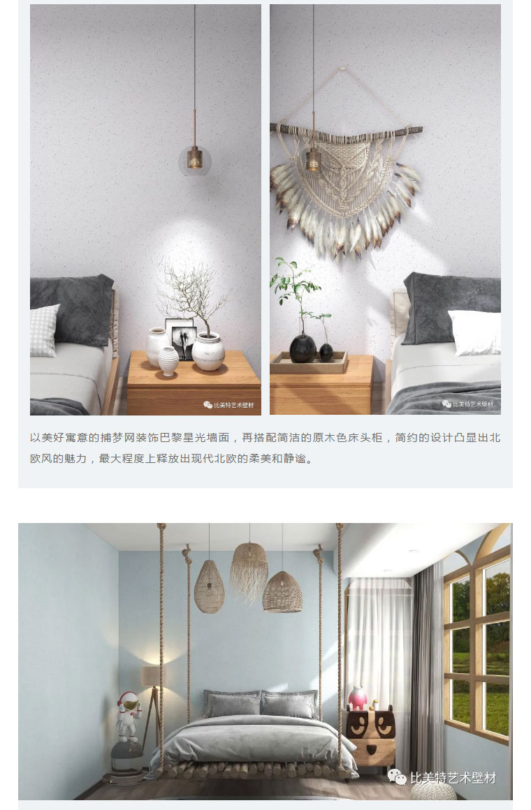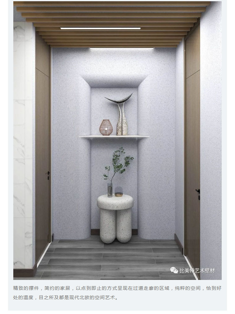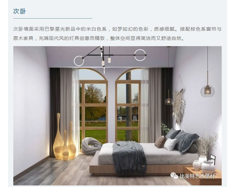 设计理念:本案整体风格以现代北欧风为主,墙面则采用比美特艺术壁材巴黎星光新品。为满足不同消费者需求,巴黎星光在原先基础上又新增30个颜色,本次墙面使用的便是巴黎星光新品。运用细腻的磨砂质感,以及柔和的色彩,演绎出家的「星光之夜」。