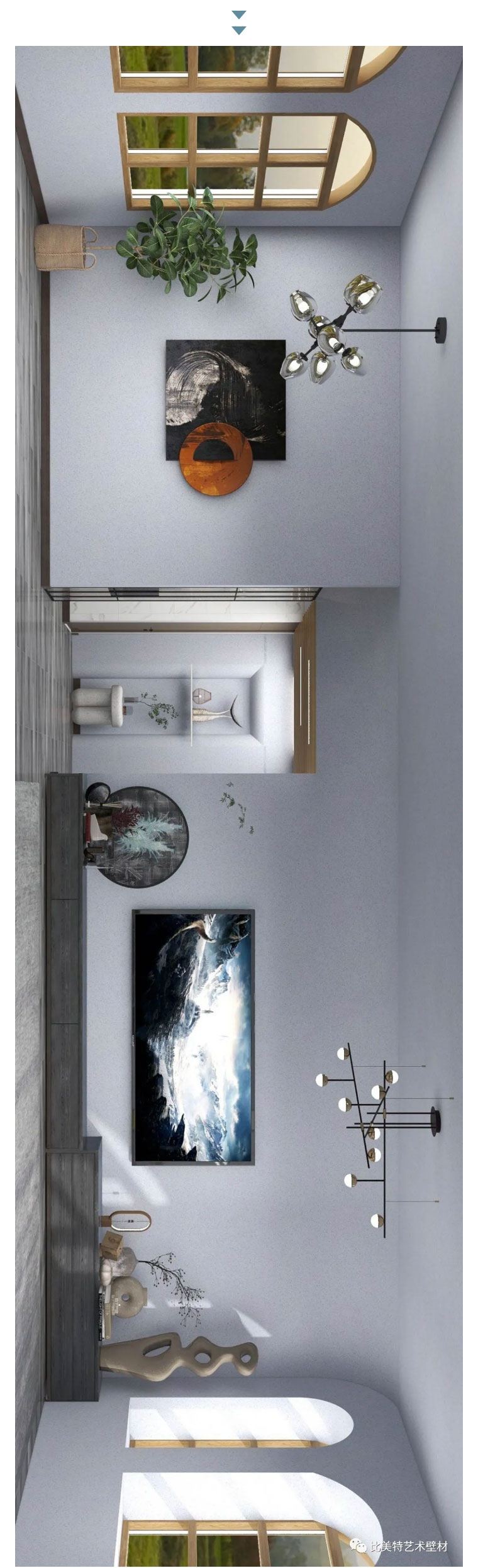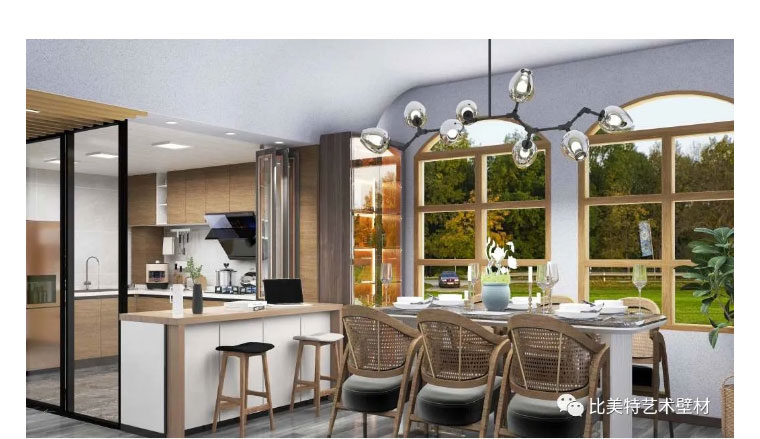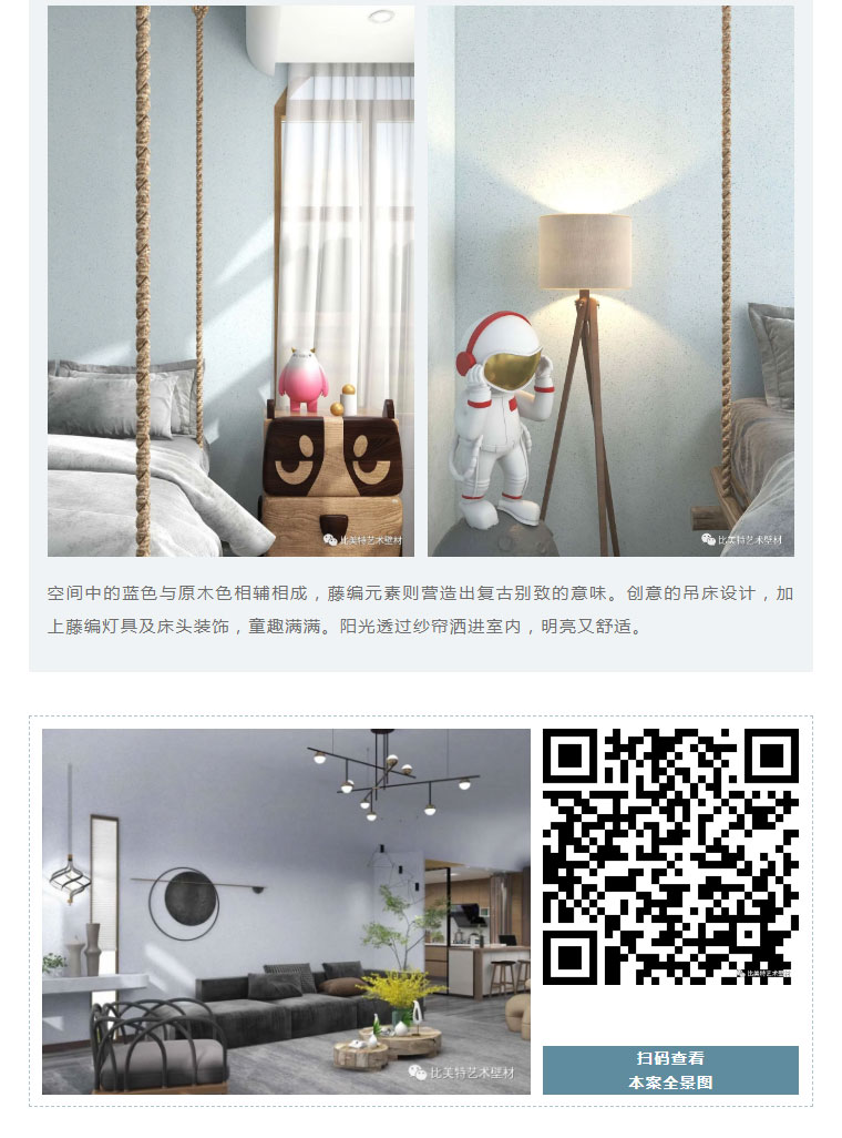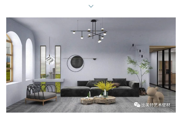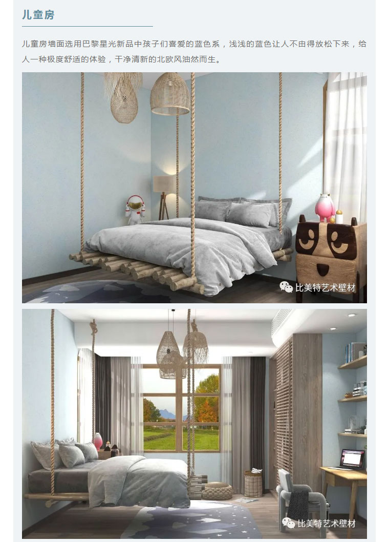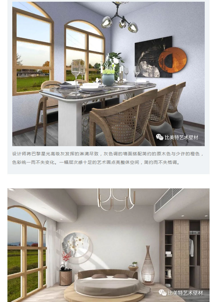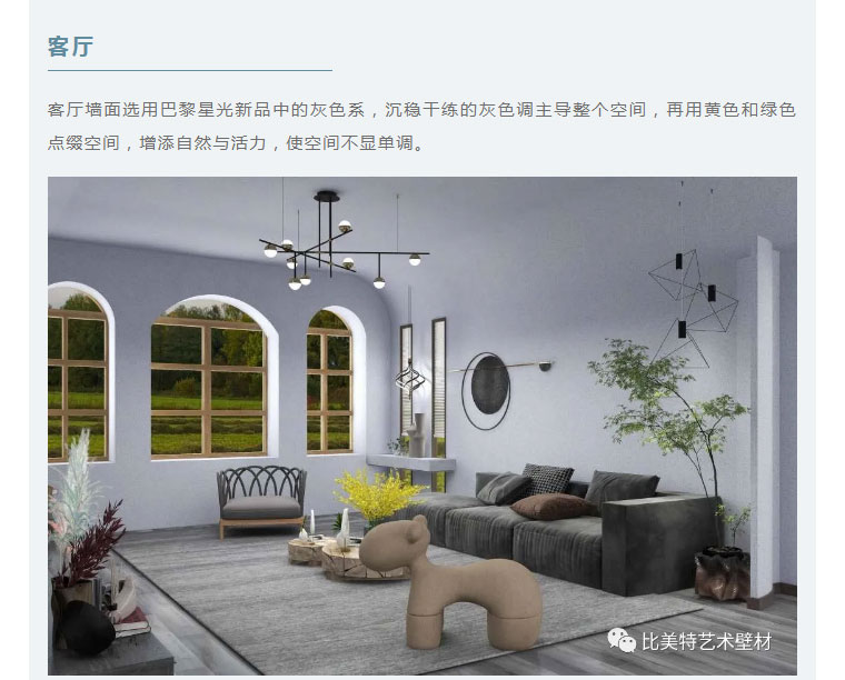 设计理念:本案整体风格以现代北欧风为主,墙面则采用比美特艺术壁材巴黎星光新品。为满足不同消费者需求,巴黎星光在原先基础上又新增30个颜色,本次墙面使用的便是巴黎星光新品。运用细腻的磨砂质感,以及柔和的色彩,演绎出家的「星光之夜」。
