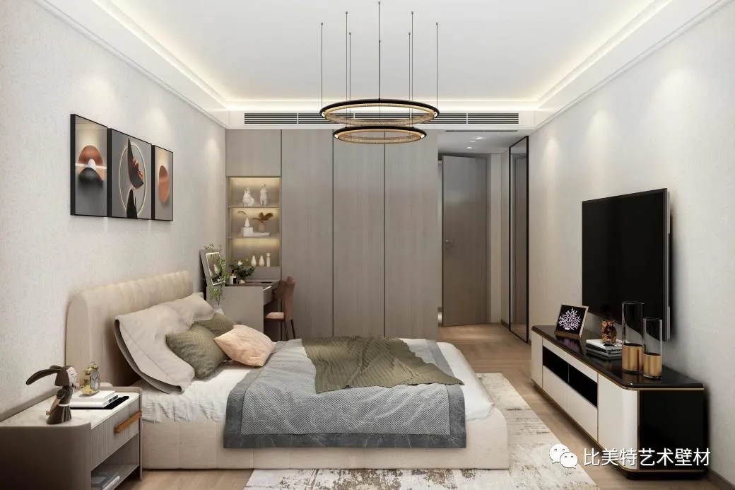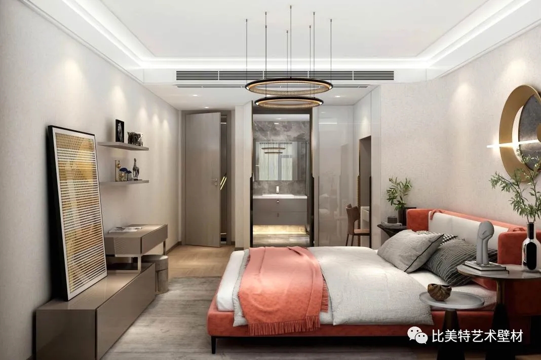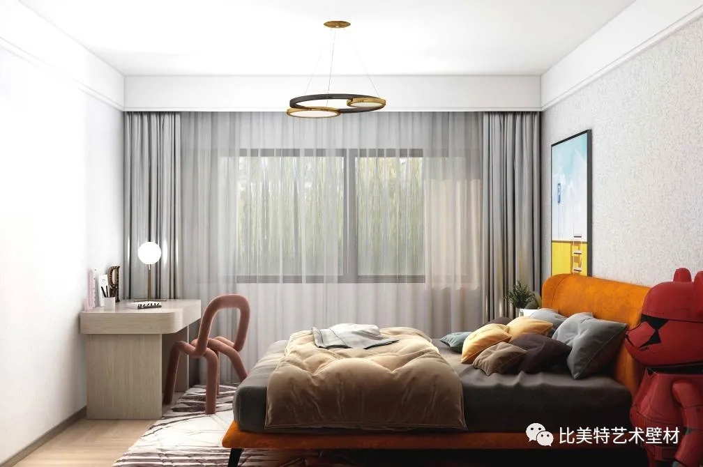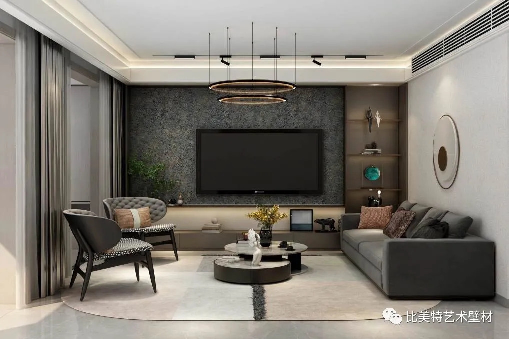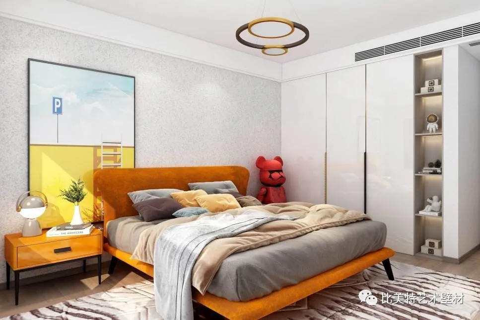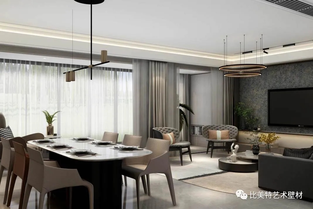 设计理念:本案整体风格以现代风为主,墙面则采用比美特艺术壁材梦幻米兰系列,用丰富的色彩与点点珠光交织出梦幻的艺术装饰效果,细腻的质感、柔和的色彩,为你打造典雅艺术的「梦幻之家」。