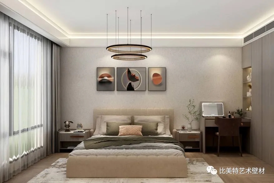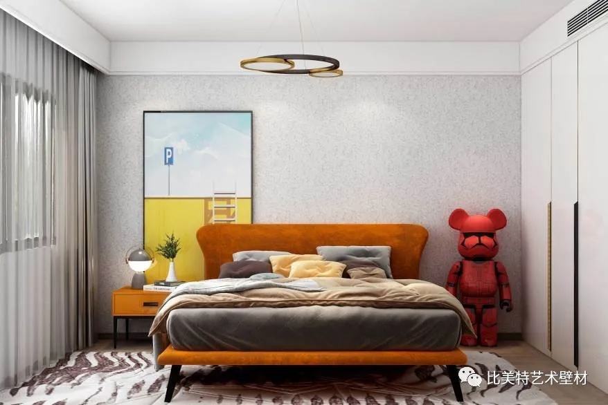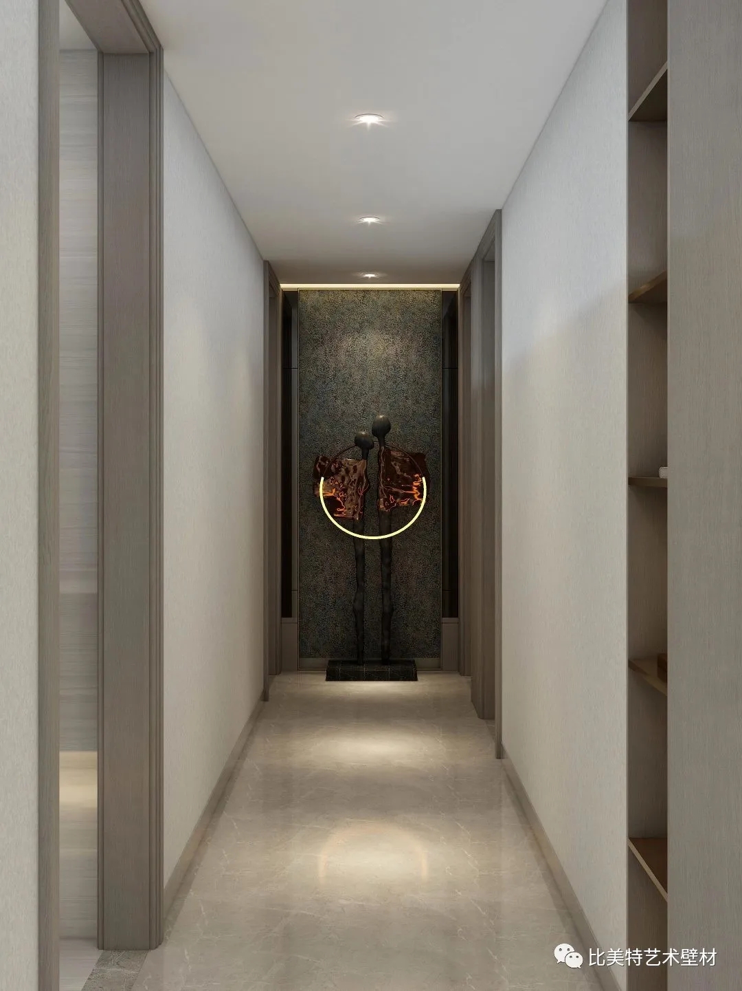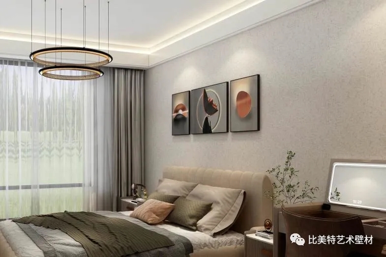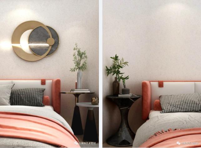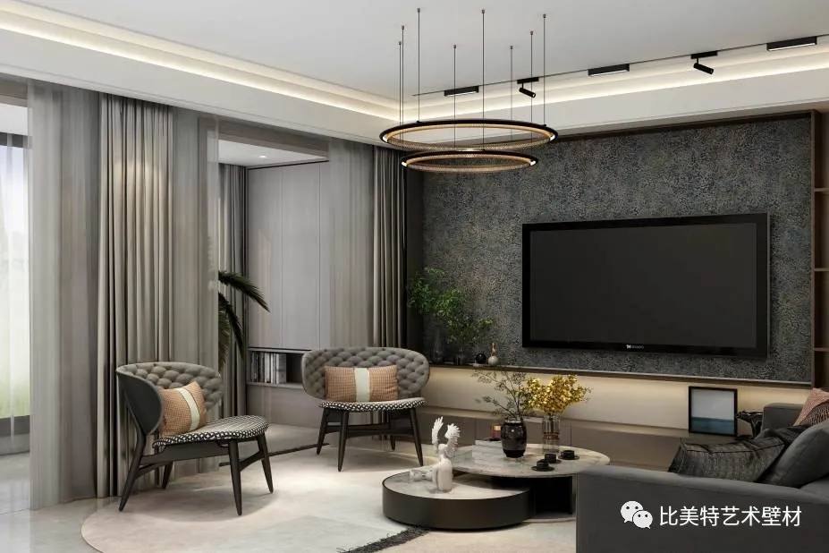 设计理念:本案整体风格以现代风为主,墙面则采用比美特艺术壁材梦幻米兰系列,用丰富的色彩与点点珠光交织出梦幻的艺术装饰效果,细腻的质感、柔和的色彩,为你打造典雅艺术的「梦幻之家」。