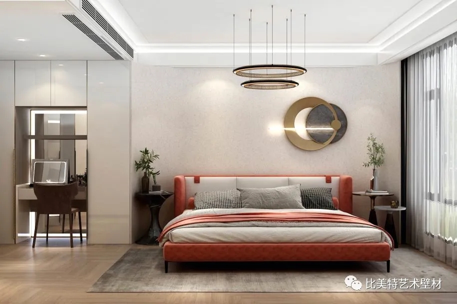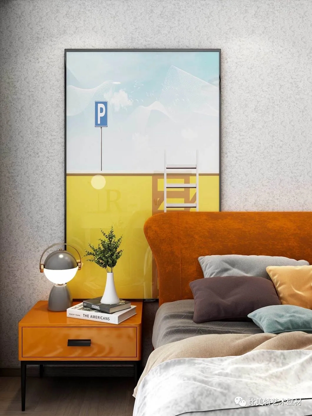 现代风格的墙面设计,是对空间尺度自由放松但动线严谨简化。主卧空间墙面采用梦幻米兰中的深浅米色,搭配咖色家具,再以橙色床品点亮空间色彩,既烘托了空间氛围,也体现了空间质感。