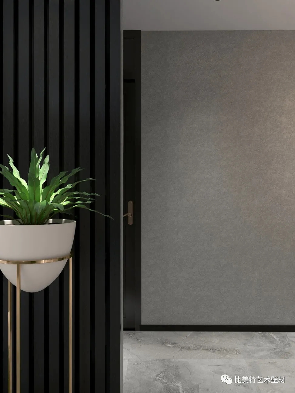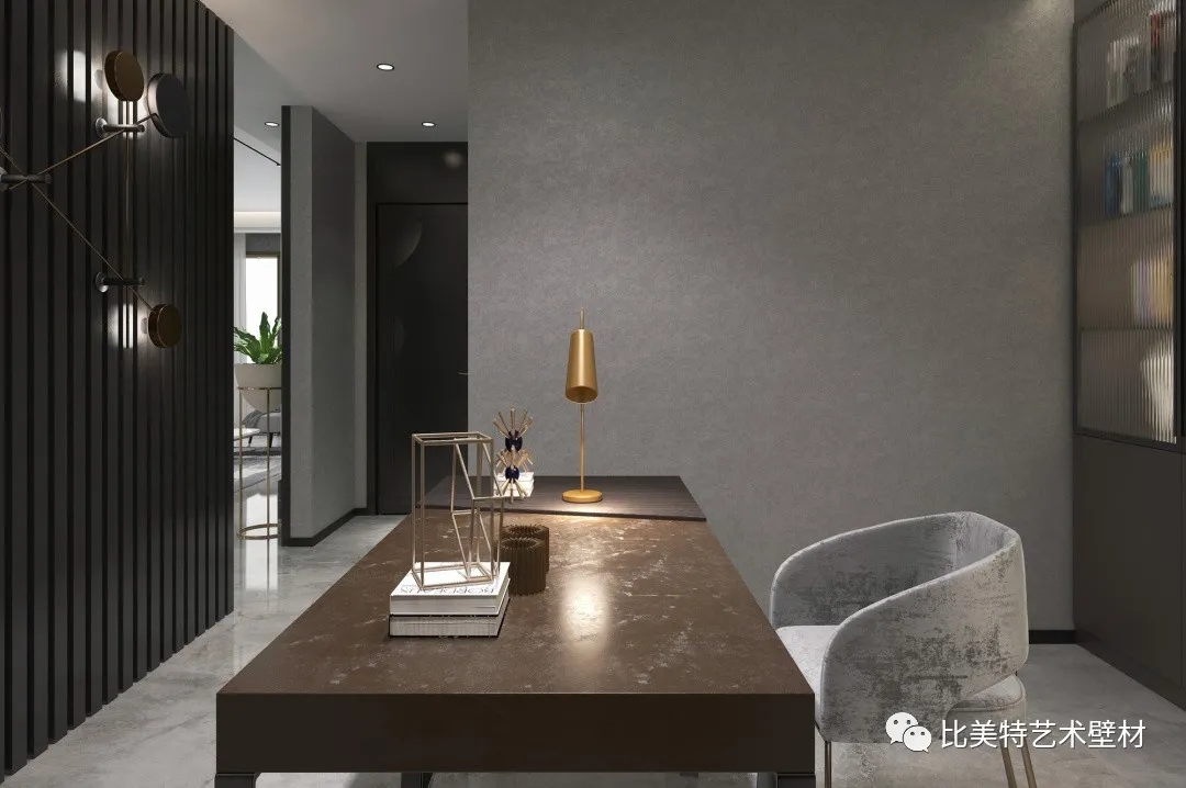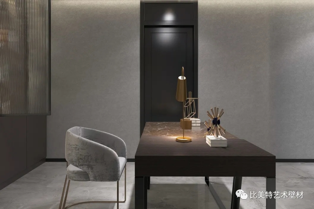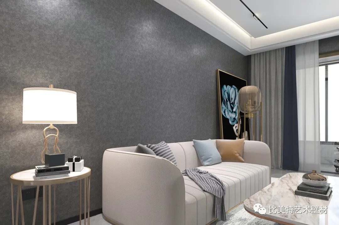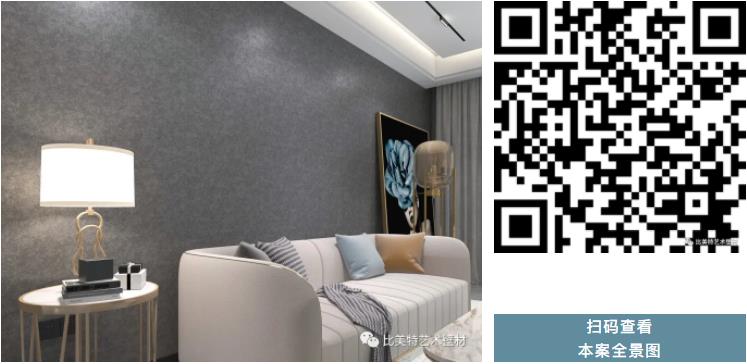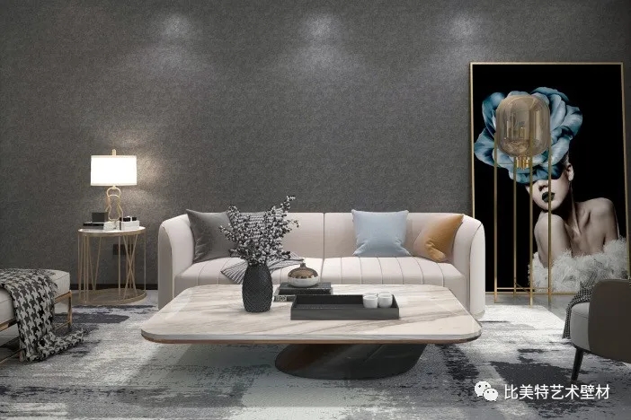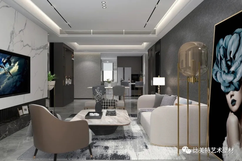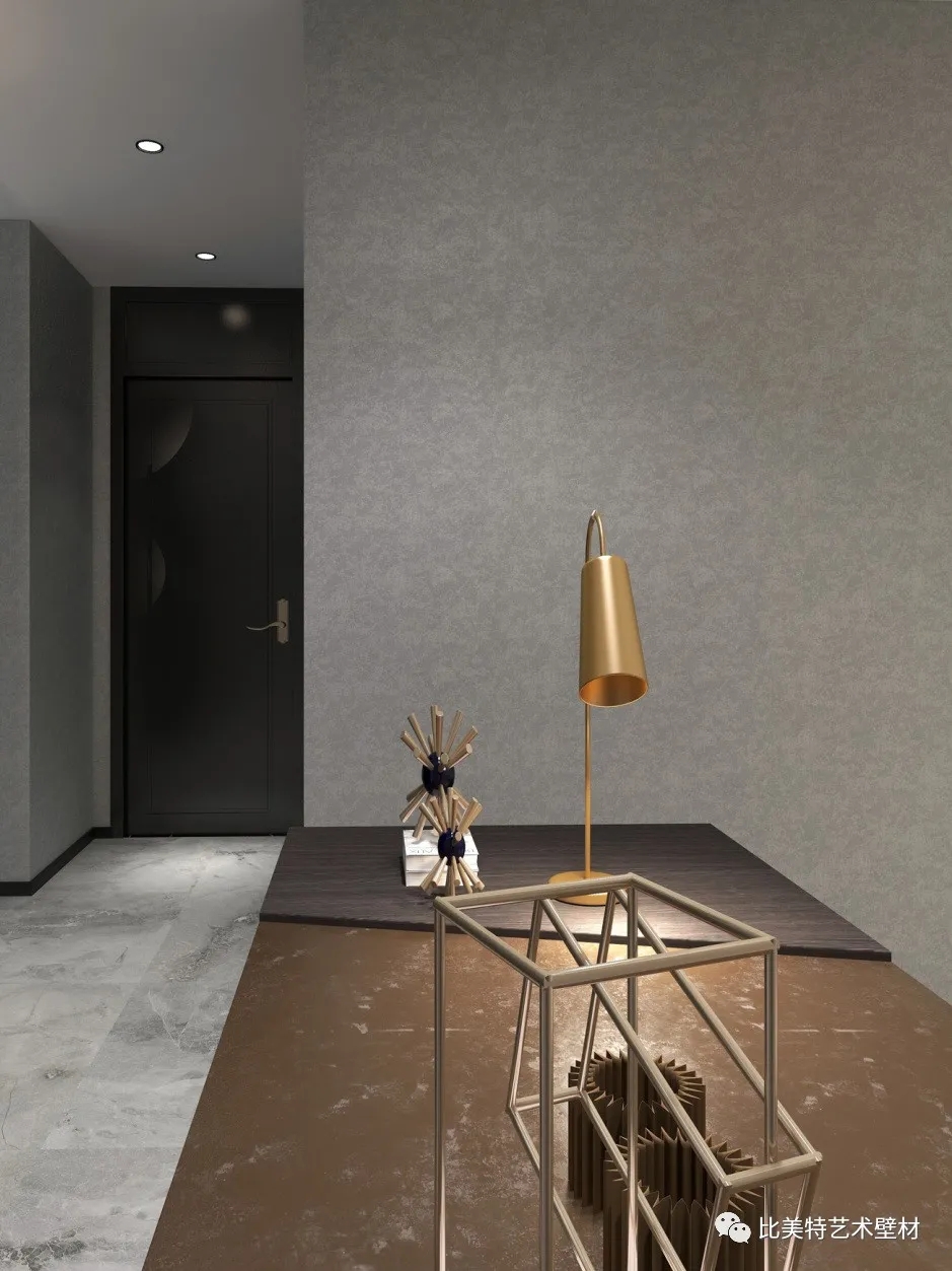 设计理念:本案整体风格以后现代为主港式为辅,墙面采用比美特艺术壁材萨特斯系列丝绸幻彩工艺,渐变梦幻的色彩和沉稳厚重的质感,多选择的个性搭配,充分展现独特的空间视角。