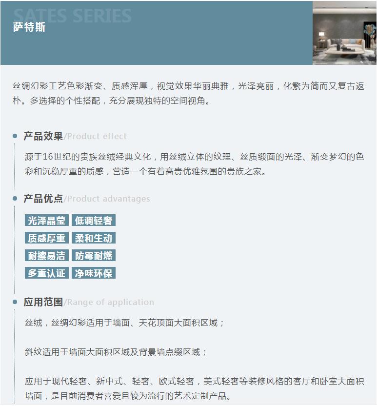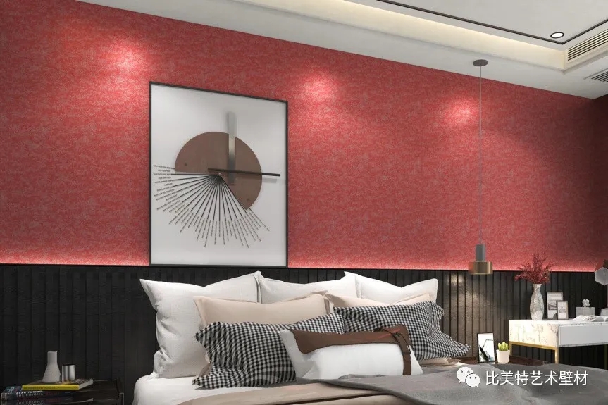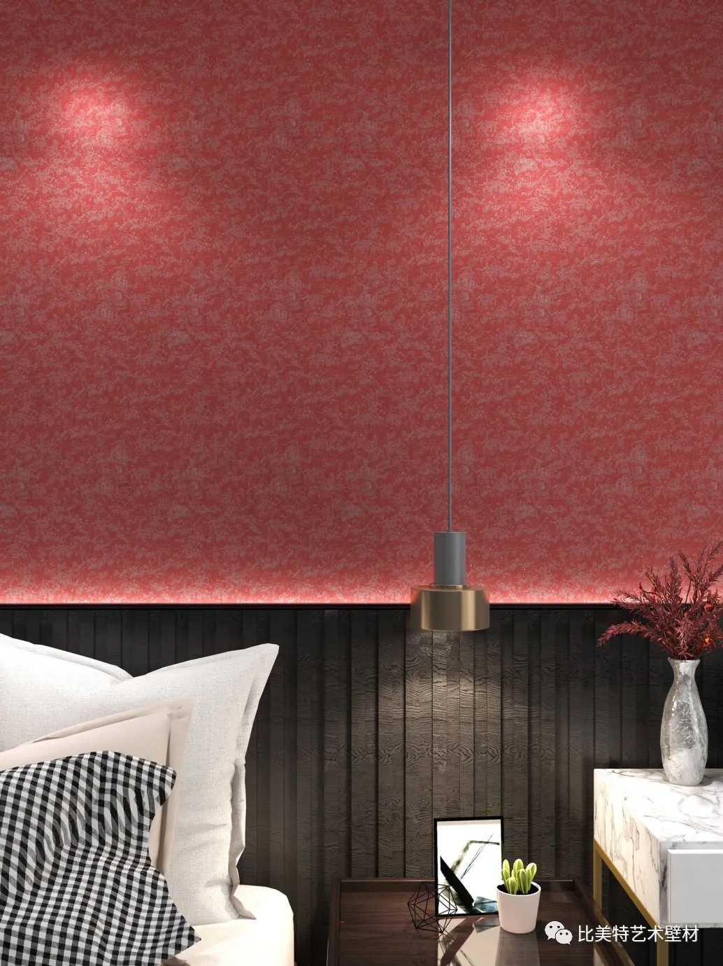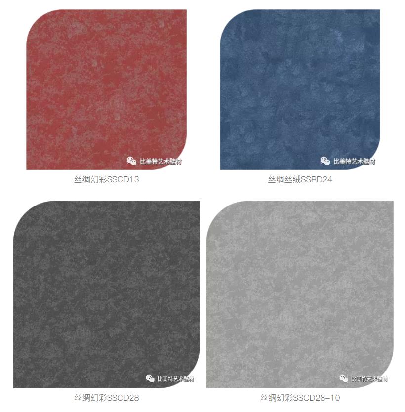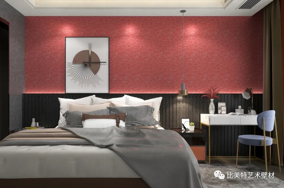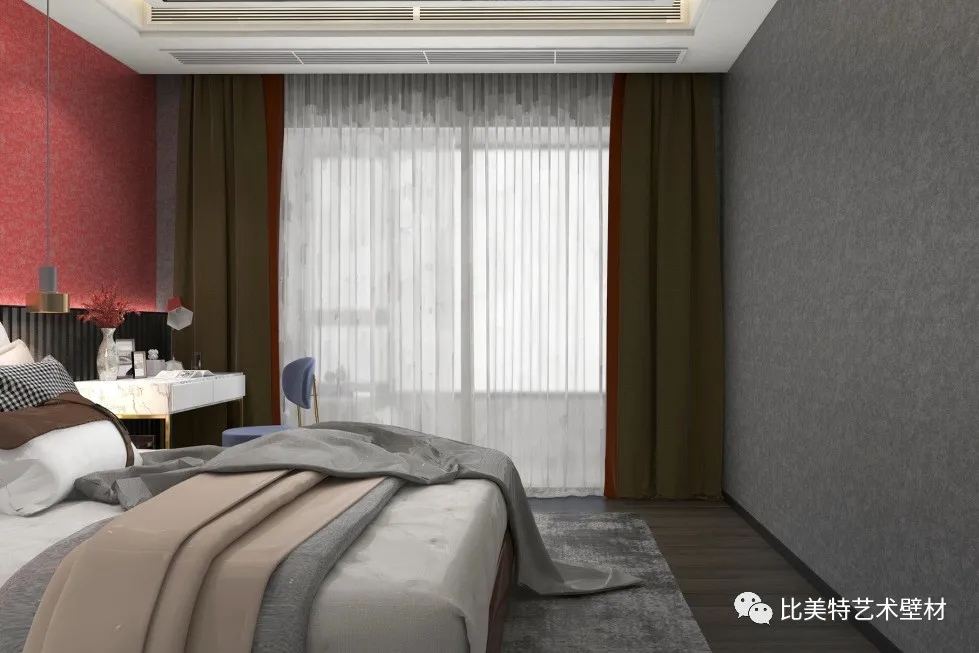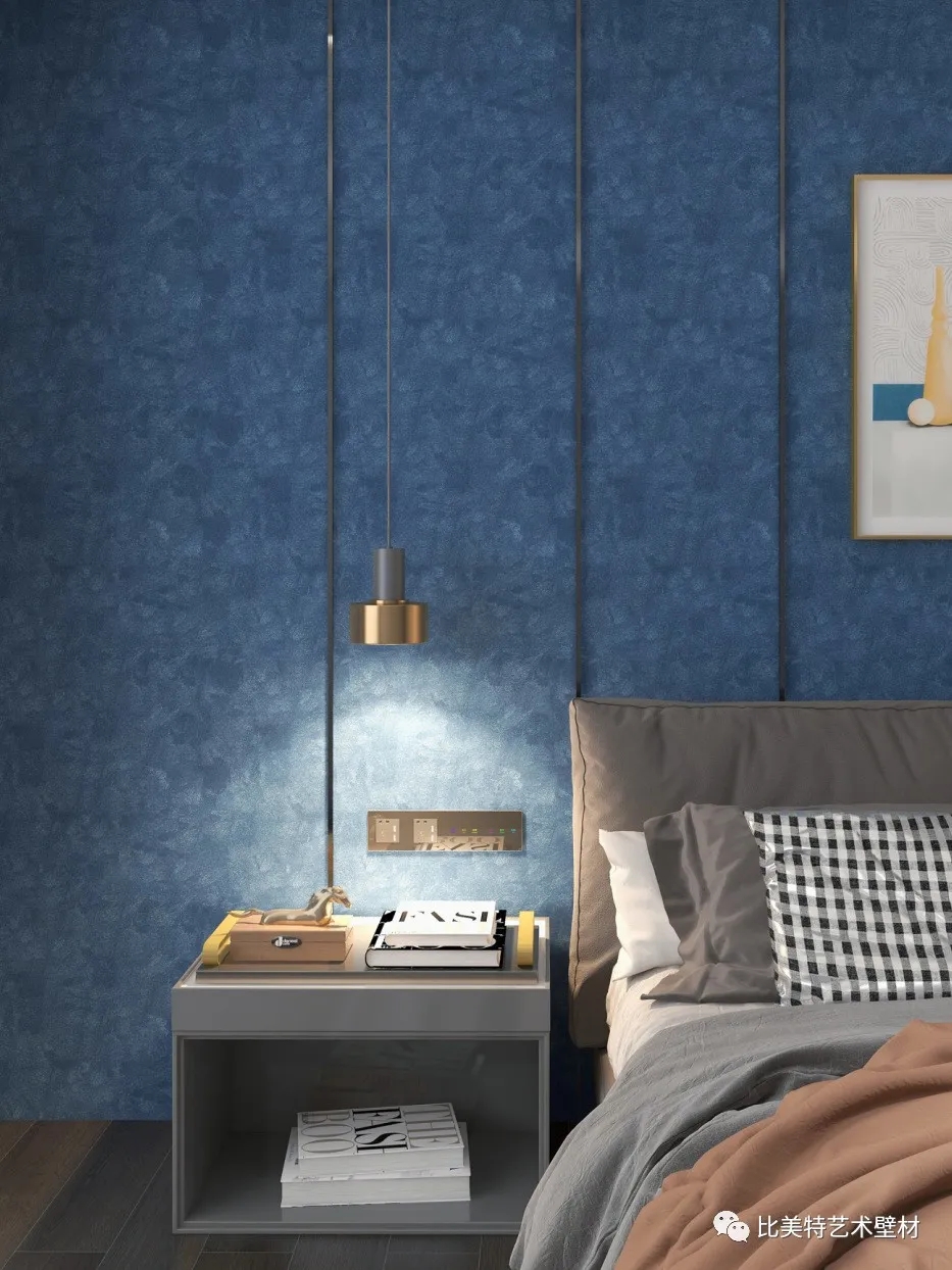 设计理念:本案整体风格以后现代为主港式为辅,墙面采用比美特艺术壁材萨特斯系列丝绸幻彩工艺,渐变梦幻的色彩和沉稳厚重的质感,多选择的个性搭配,充分展现独特的空间视角。