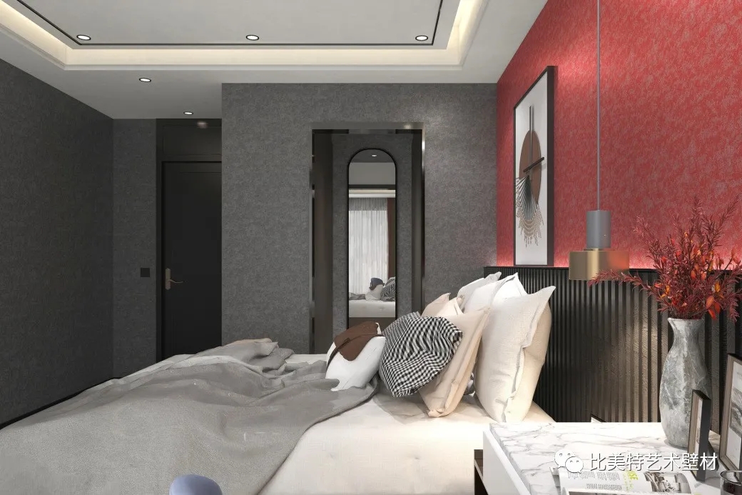 主卧床头背景墙大胆选用丝绸幻彩中的红色系打破空间色彩,其他三面墙仍沿用客餐厅的灰色调,整体设计将线条拼接和色彩碰撞运用到极致,力求契合居住者的生活心态和品味追求。