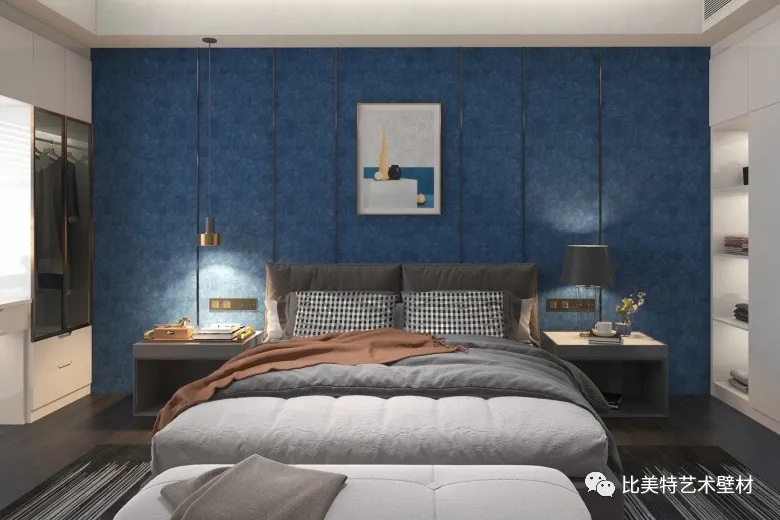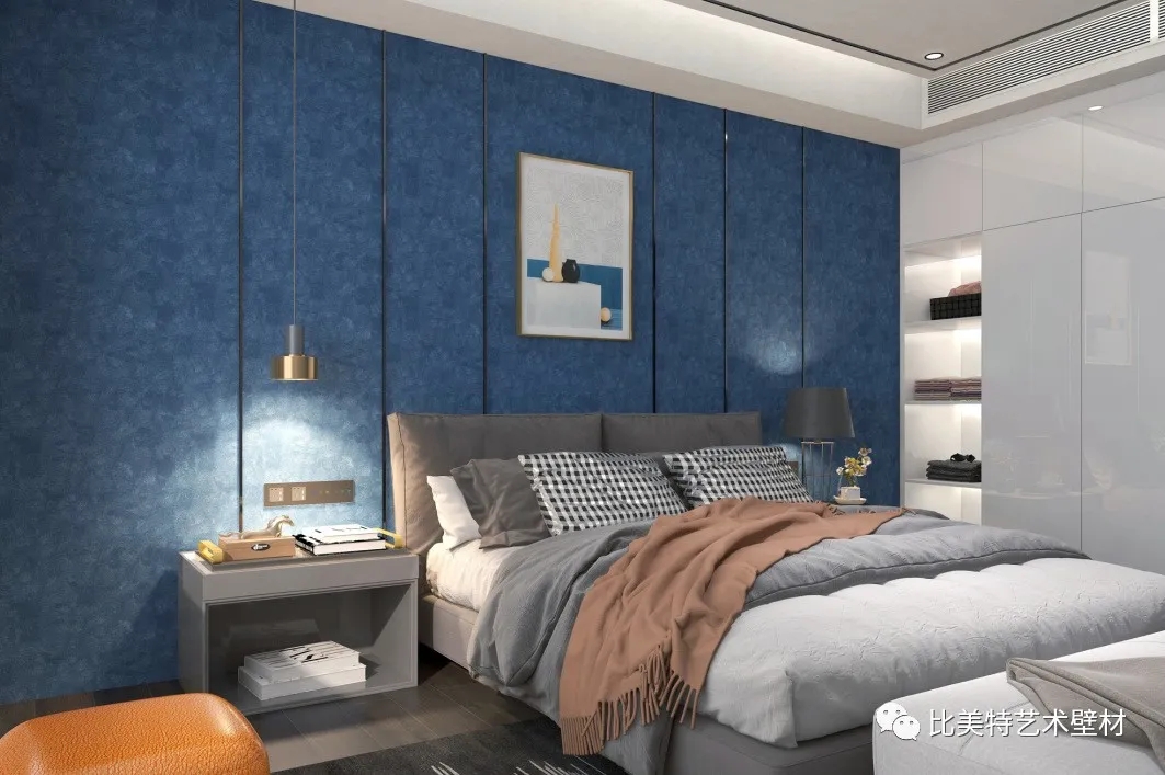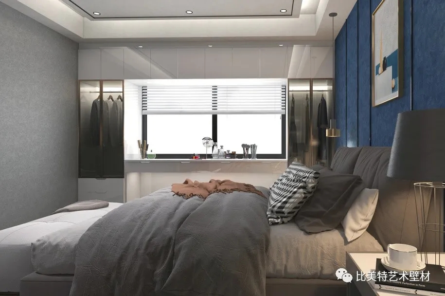 老人房床头背景墙则选用丝绒中的蓝色调,与咖灰色床品搭配更显和谐,简约的线条与金属元素,让整个卧室设计感十足。整体空间简洁舒适、自然清新、透着浓浓的生活气息。