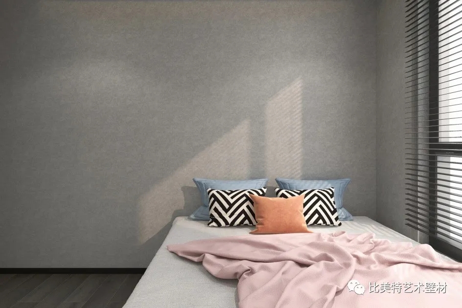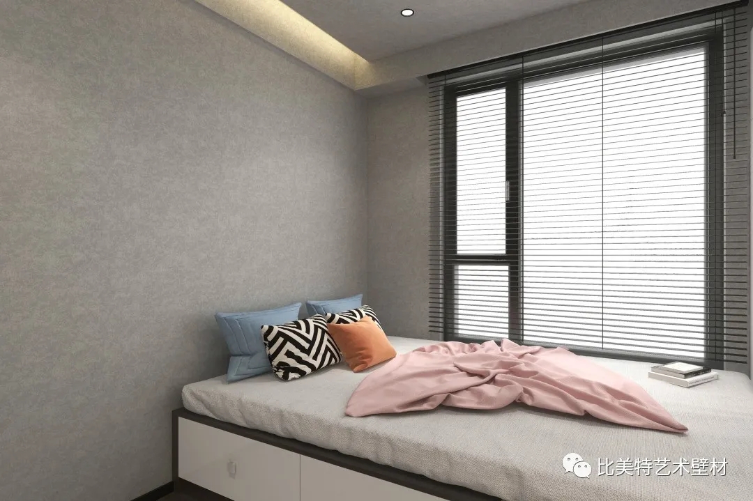 儿童房设计也以简约实用为主,墙面选用丝绸幻彩的浅灰色,灰色调背景墙和灰色调软装结合,不同层次的灰色让卧室不会那么单调,蓝灰色的靠枕与粉色床单也很适合孩子居住。
