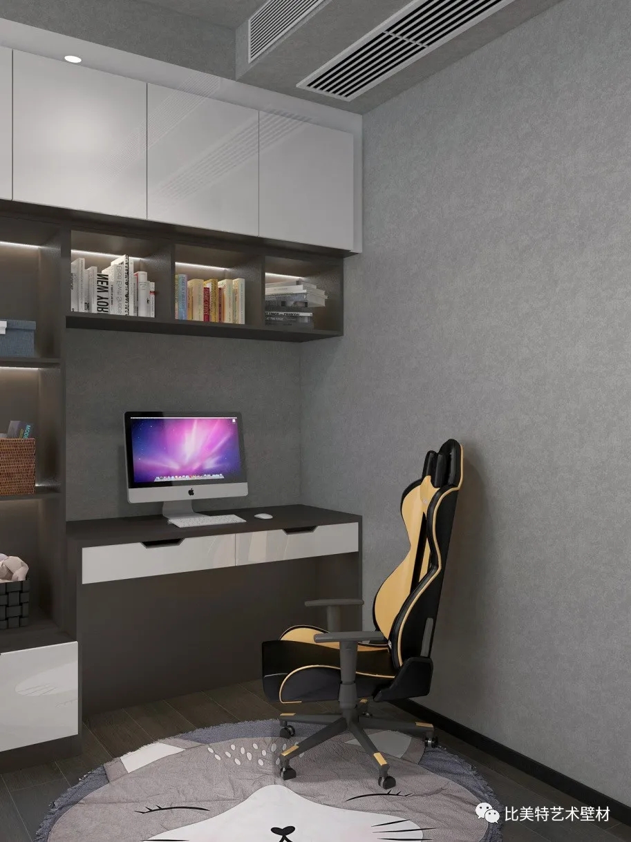 在餐厅后设置半开放的书房,墙面沿用丝绸幻彩的灰色调,中性咖色的桌子,结合深色家具做搭配,于细节处凸显生活的简约精致。充满个性化的后现代风格空间,避免了千篇一律。