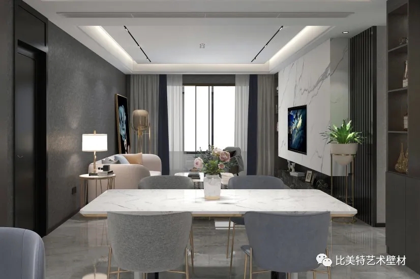 客餐厅整体以白灰色调为主,加入了大理石和金属元素,让整个客餐厅充满后现代的和谐与优雅。给人一种时尚大气而又高雅冷静的感觉,营造惬意轻奢的居住氛围。