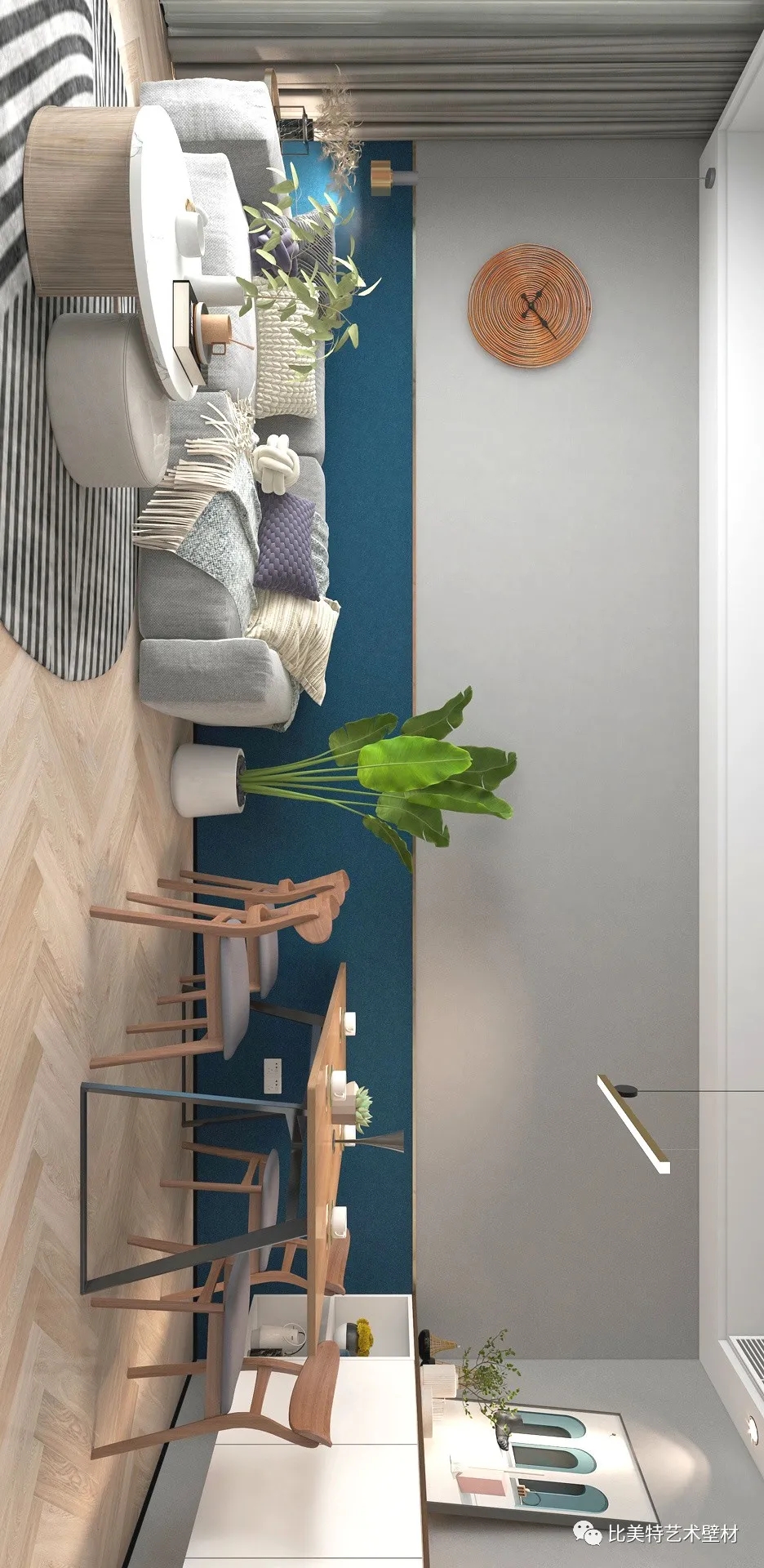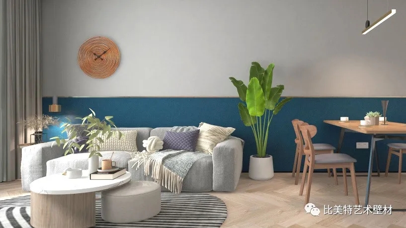客厅沙发背景墙选用克瑞斯的浅灰色与深蓝色进行拼色,轻奢含蓄的磨砂纹理在灯光的照射下,闪耀着点点光泽,浅灰与深蓝的搭配给人一种清新自然的感觉。绿植的放置也给空间增添生机活力,体现北欧风对自然生态的追求。