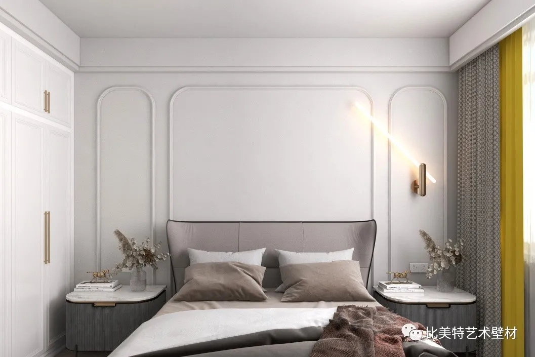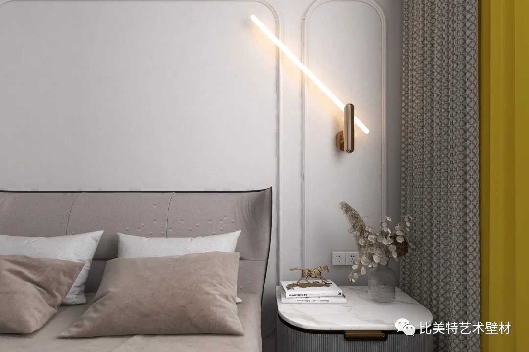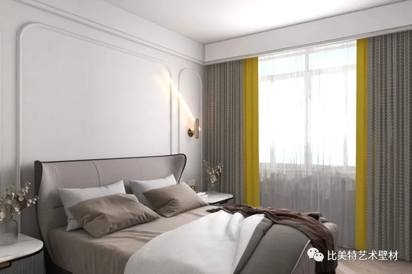 主卧空间的背景墙则选用克瑞斯银白色,小户型使得主卧空间不大,但两边仍有床头柜的区间,灰白色基调下,给空间更多的可能性。